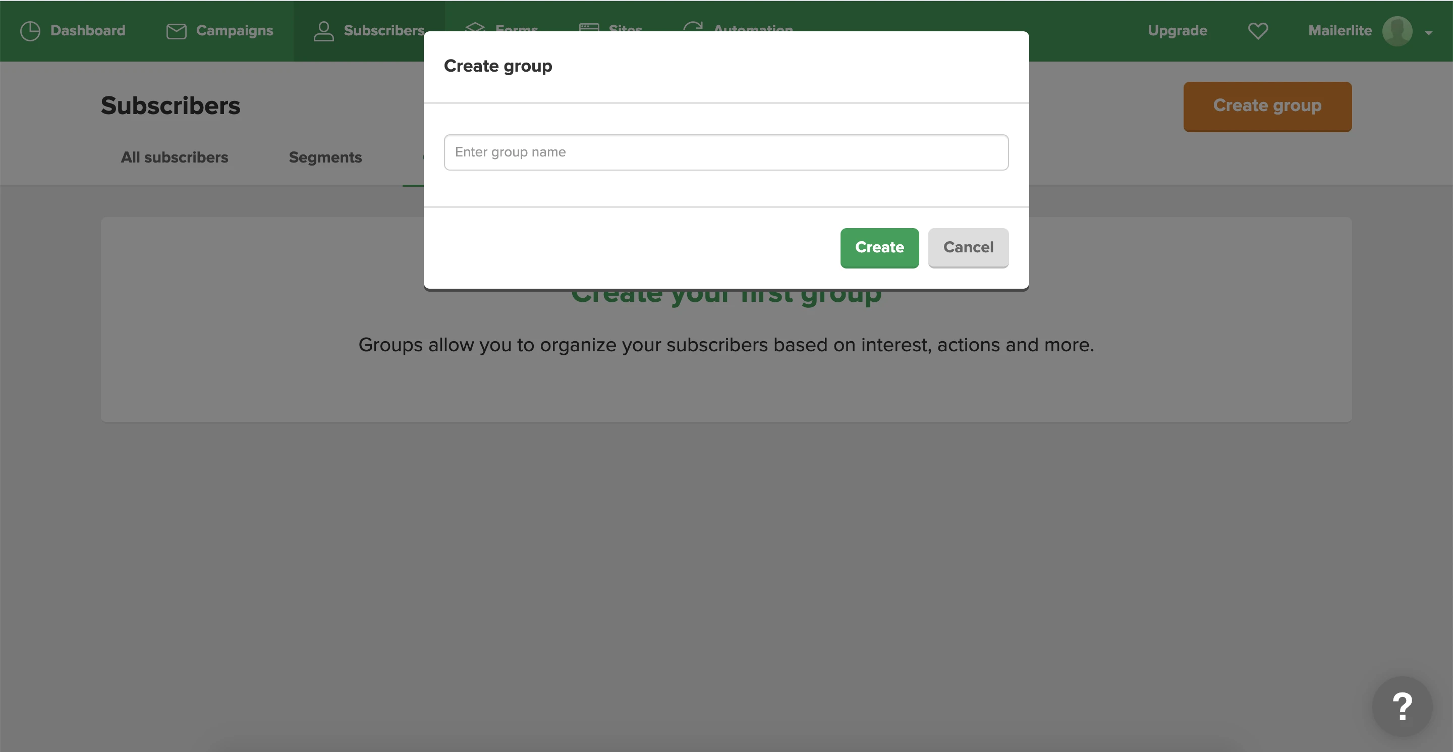 When adding a subscriber to a group, you can either type the name of a pre-created group to select it, or you can type the name of a new group and hit enter to create it.