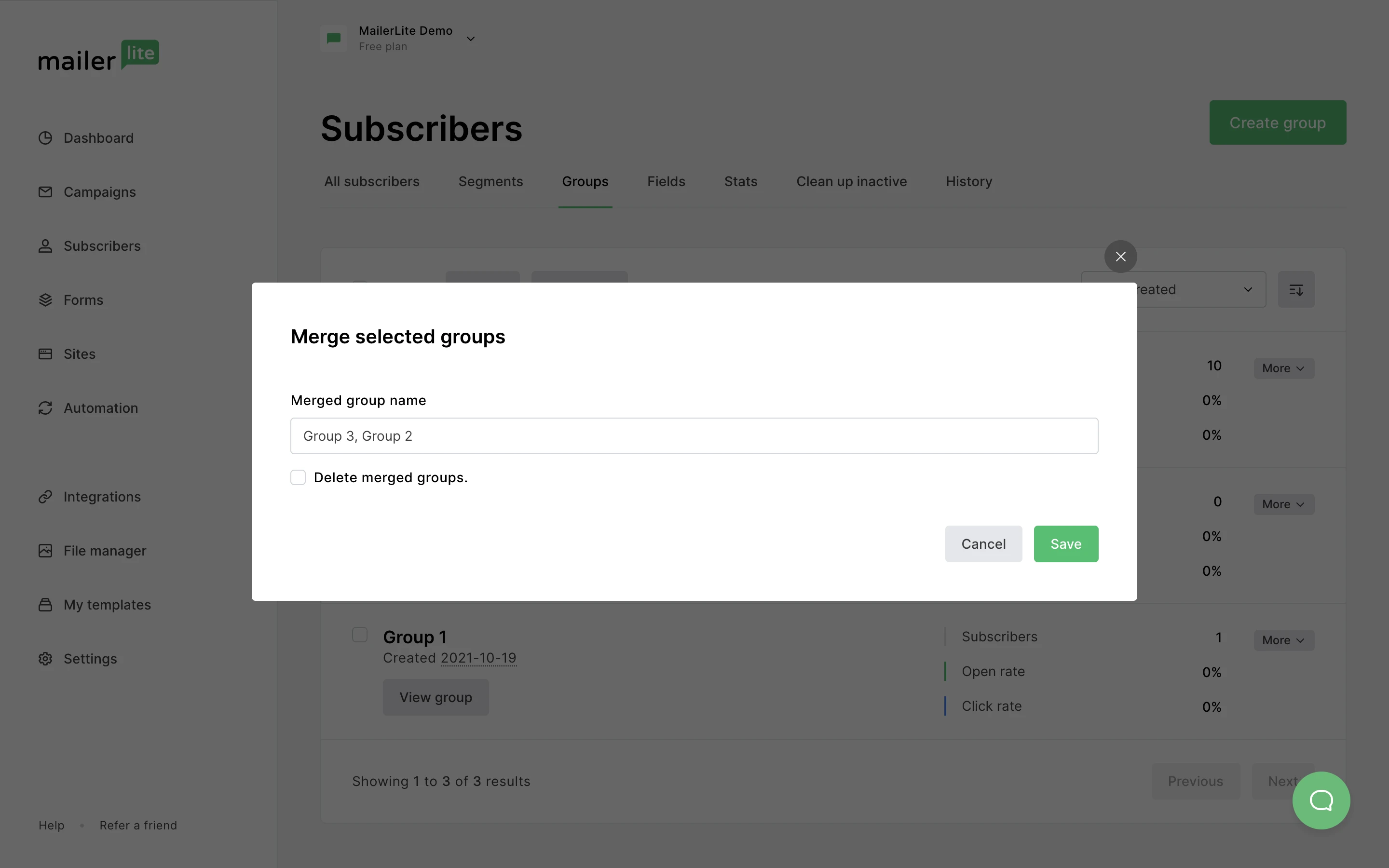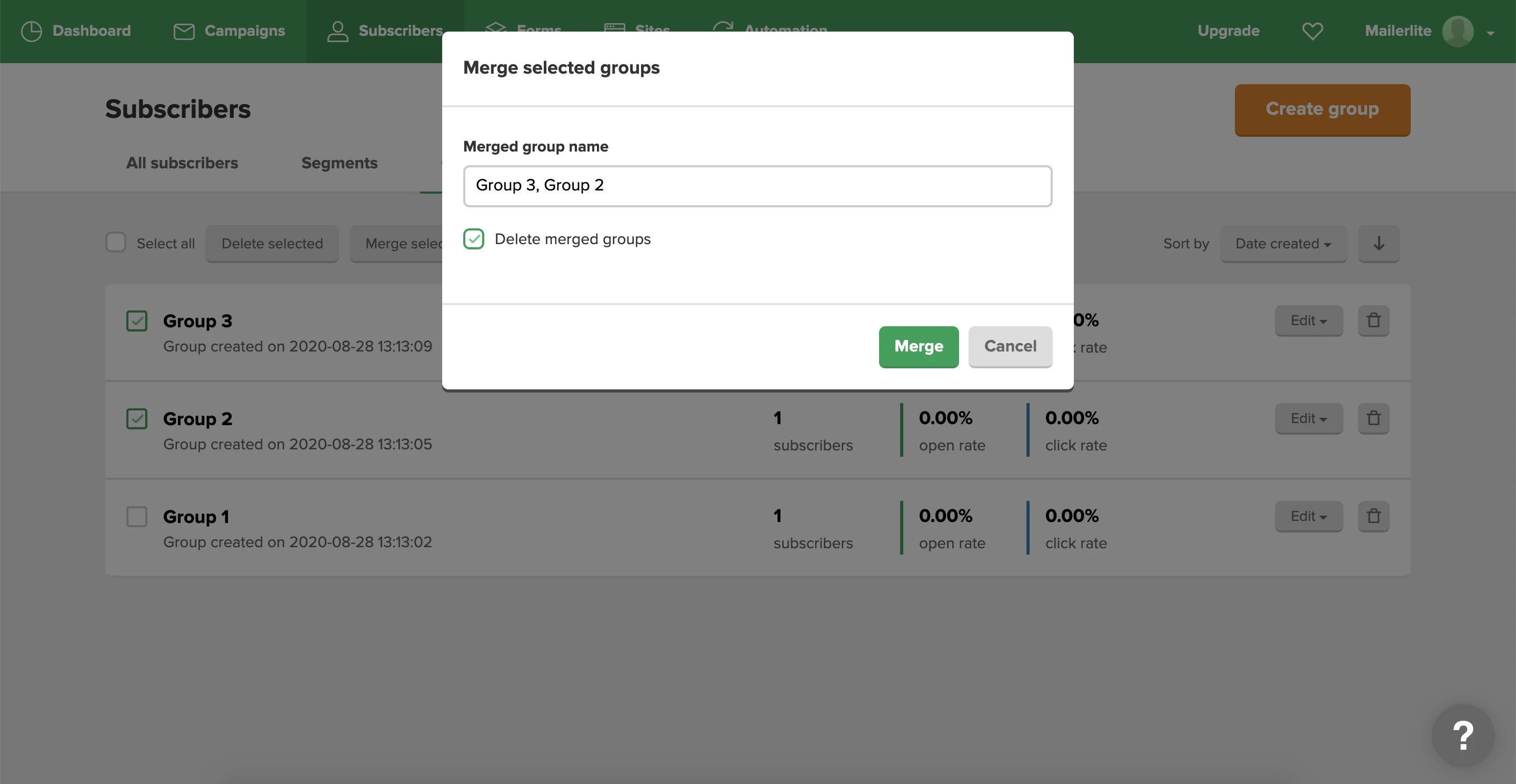 Note: Groups created by merging other groups function as totally individual, new groups. If you delete the merged groups, any active automations using those groups will fail to complete.