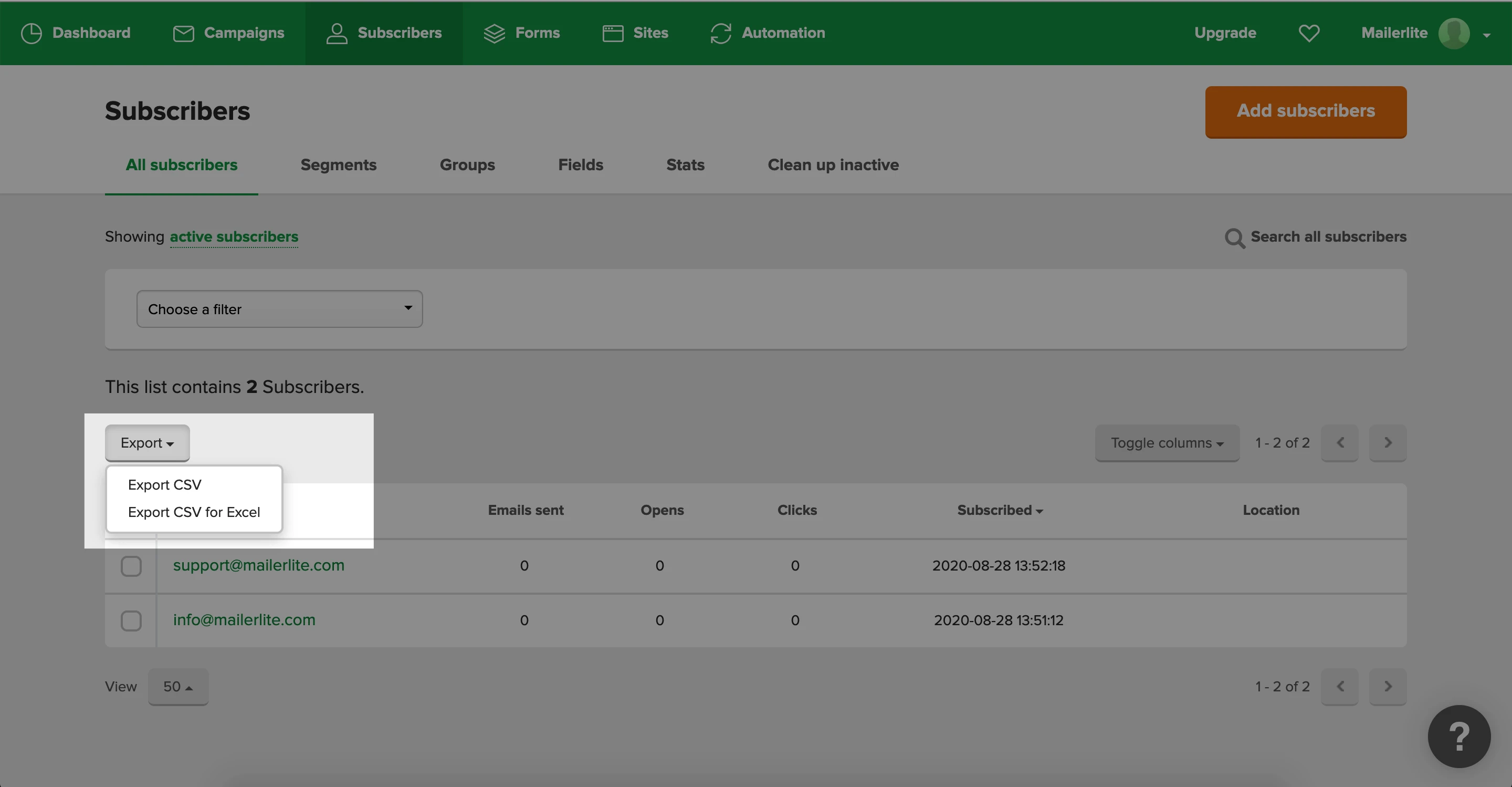 Click the Export button above the subscribers list.