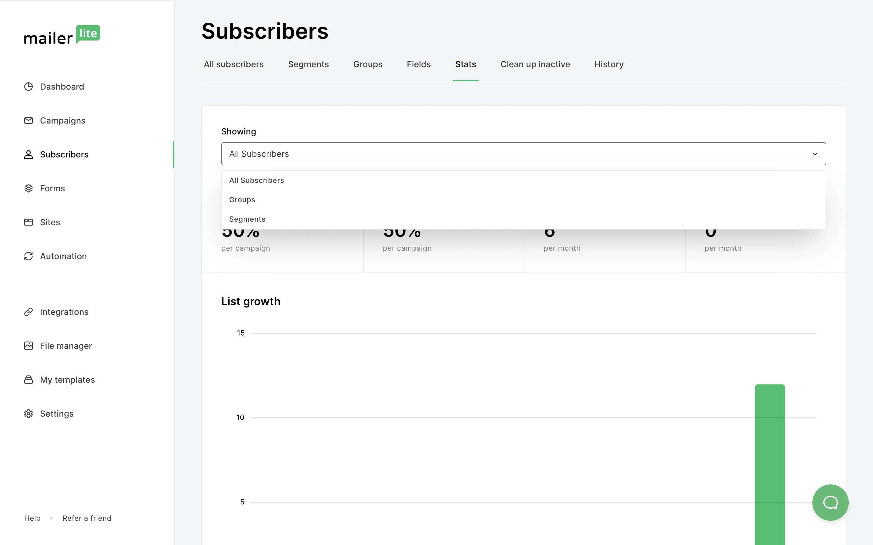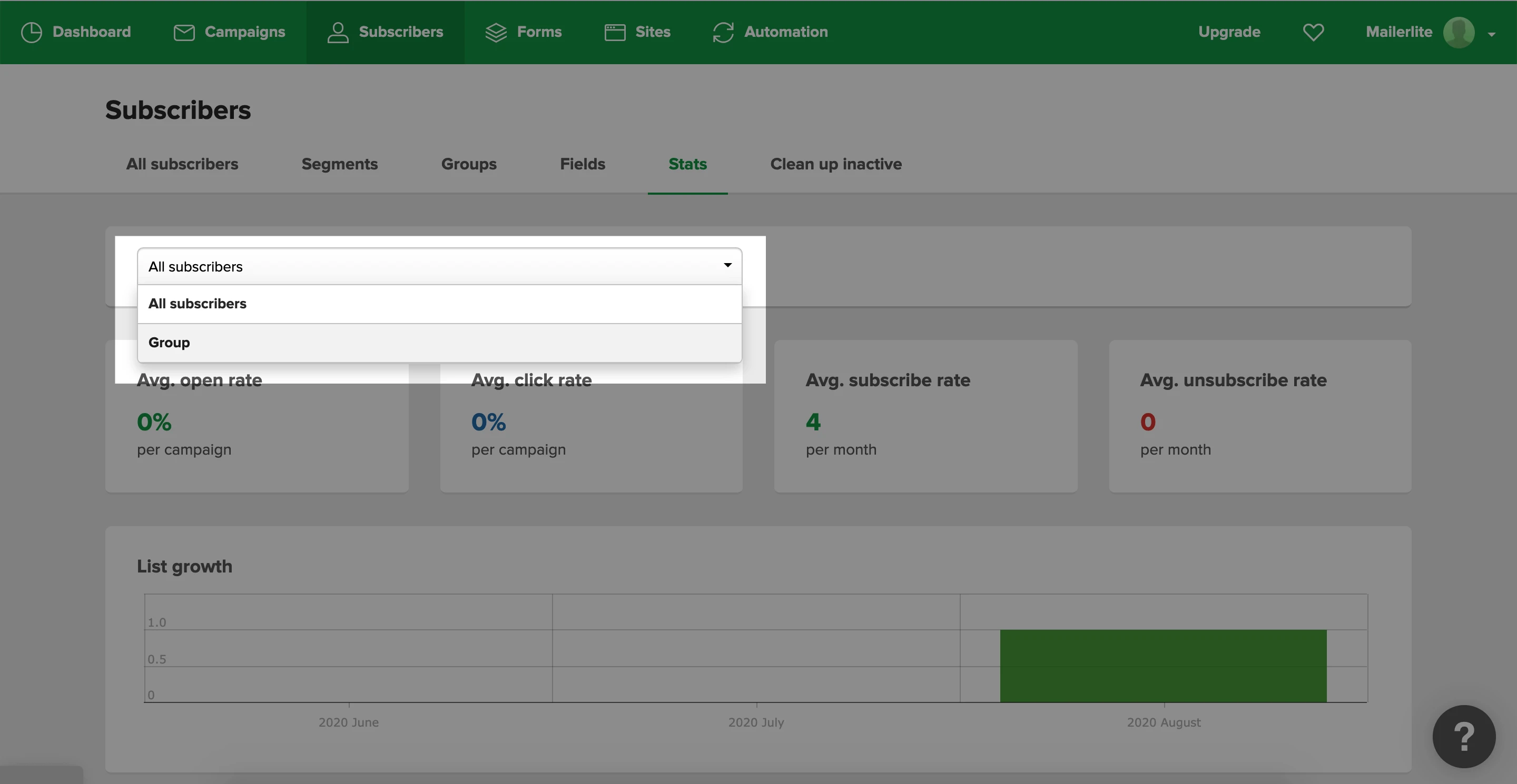 Use the dropdown menu to select whether you would like to view all subscribers’ statistics, a segment's statistics or a group’s statistics.