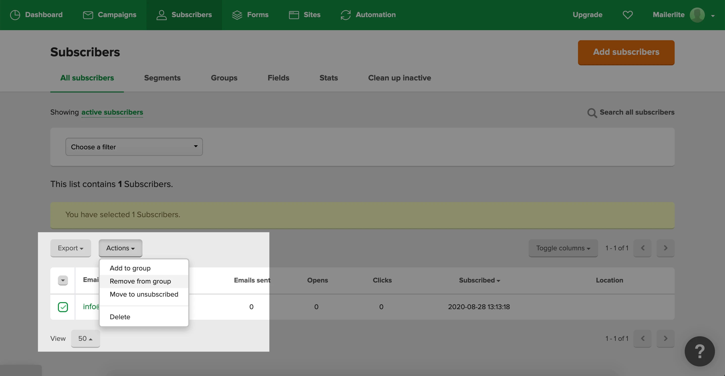 Then, select the group from which you are removing the subscribers and click Remove.
