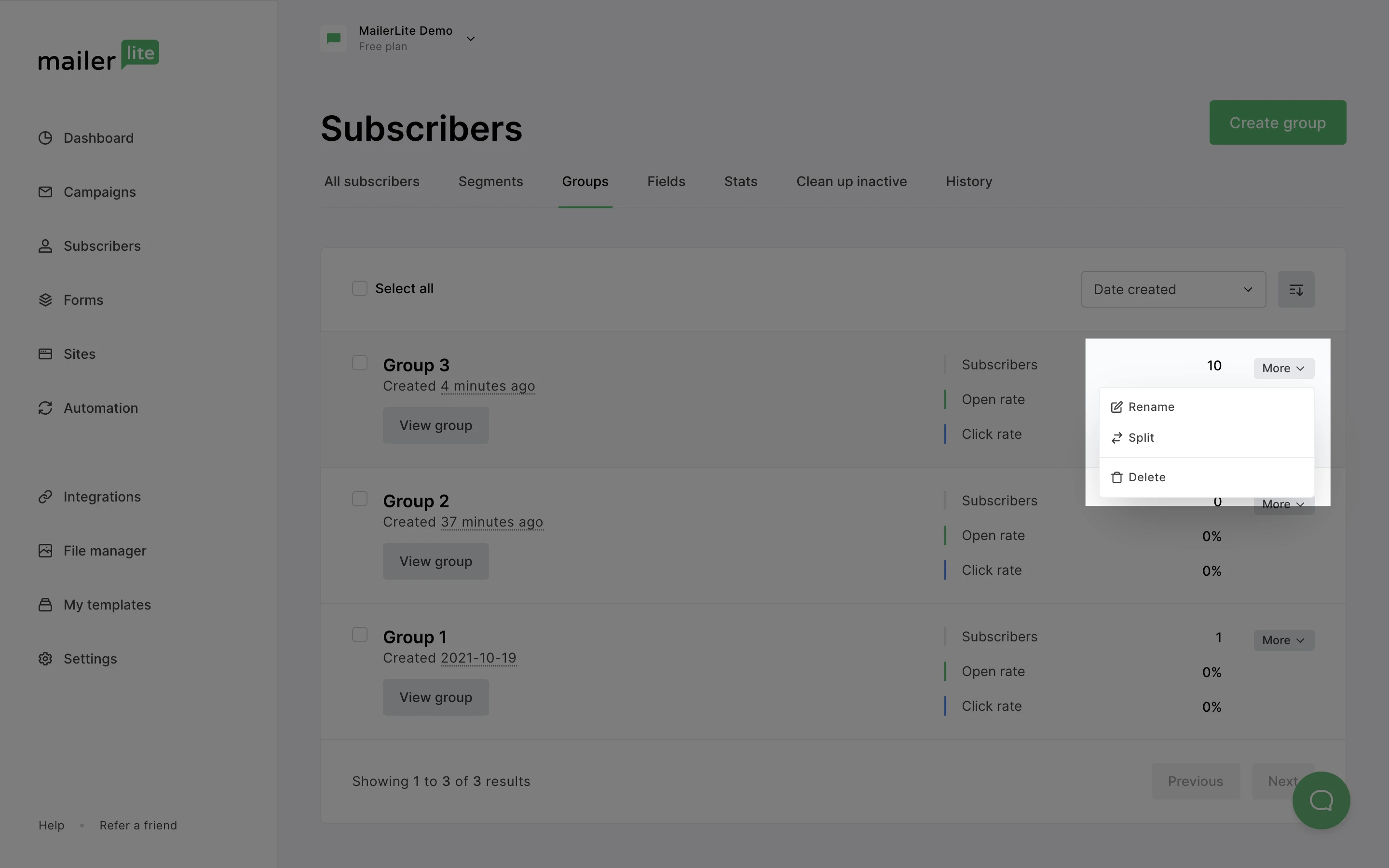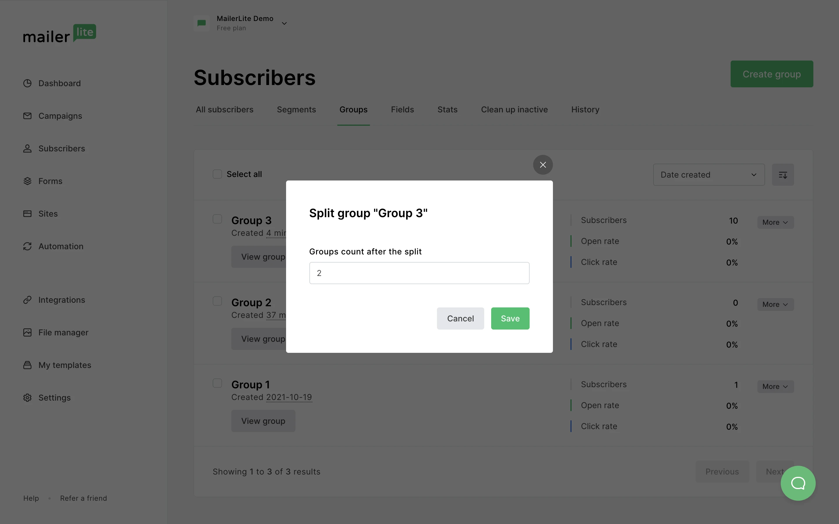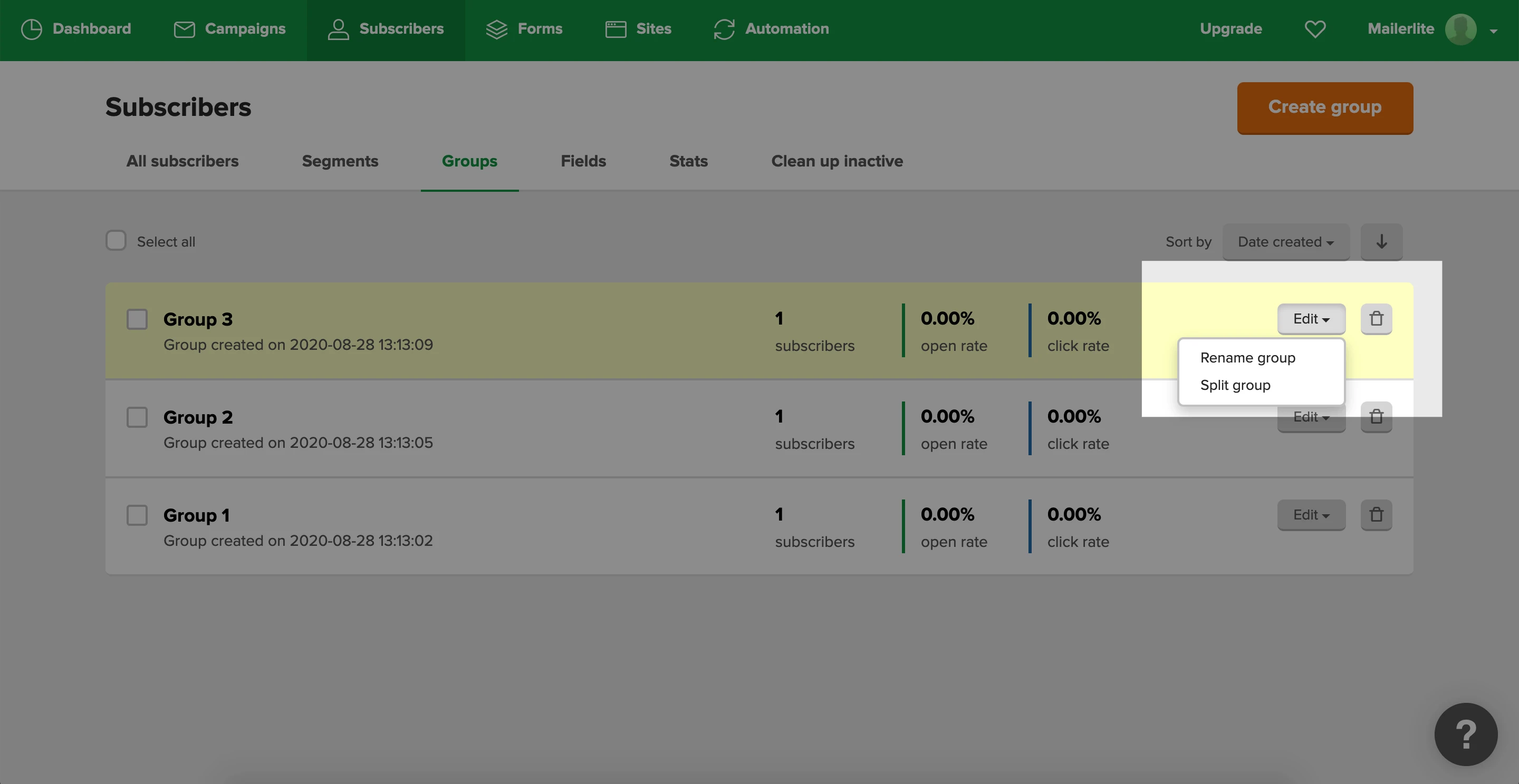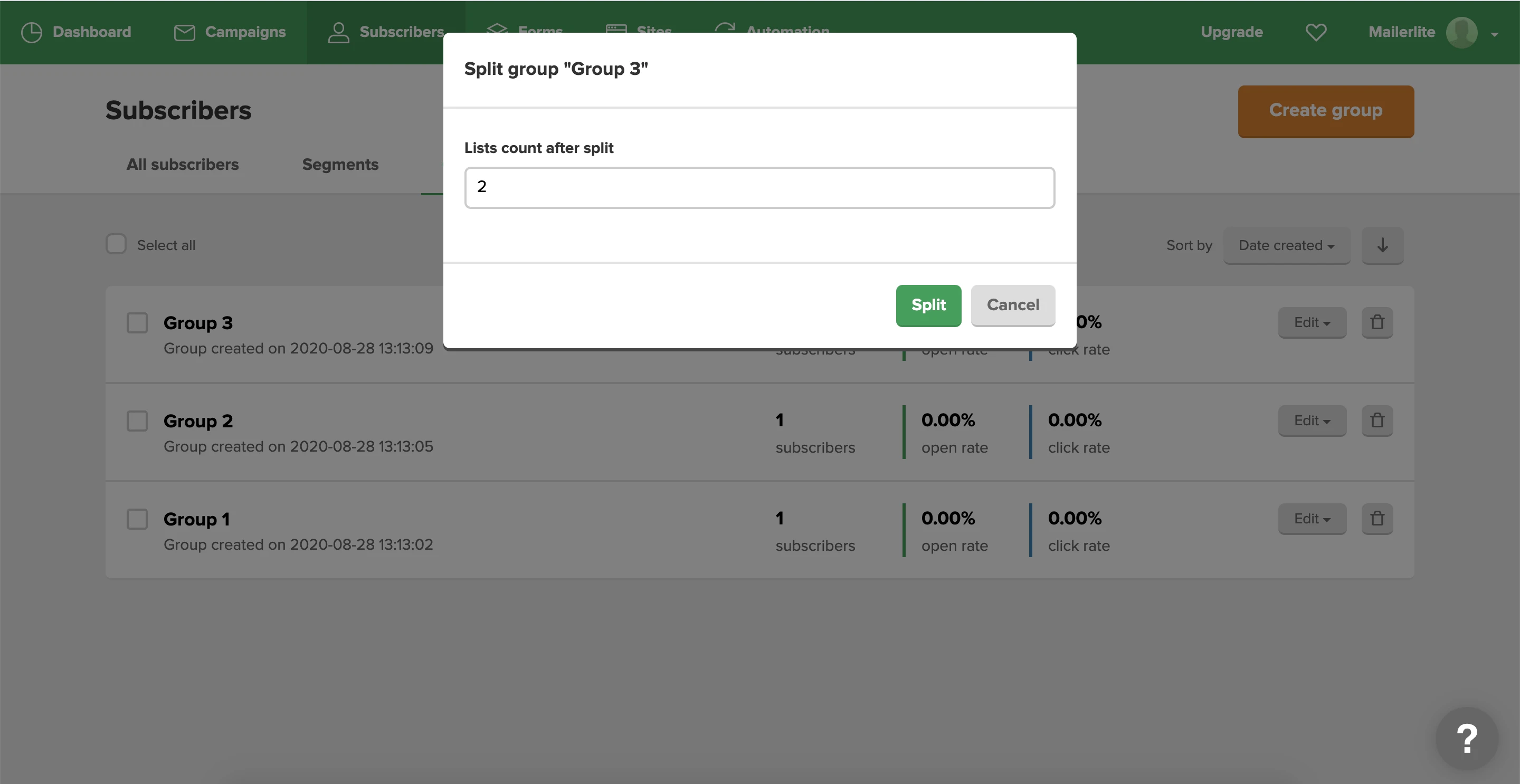 Note: The larger the group, the longer the split will take. If at first your new groups don’t appear to have subscribers in them, simply refresh your page.