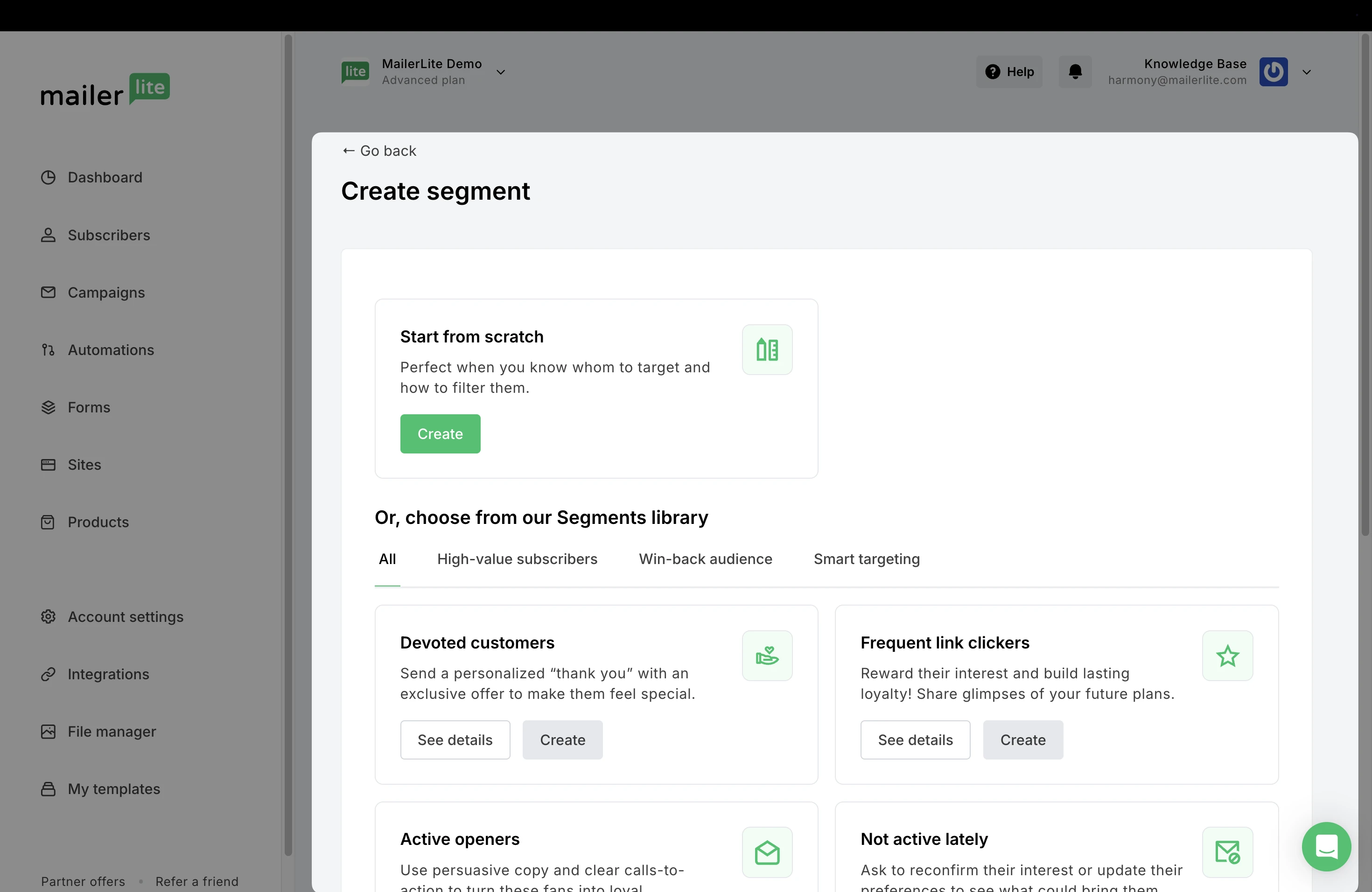 Choose to create a segment from scratch by clicking Create, or choose pre-made filters from our segment library.