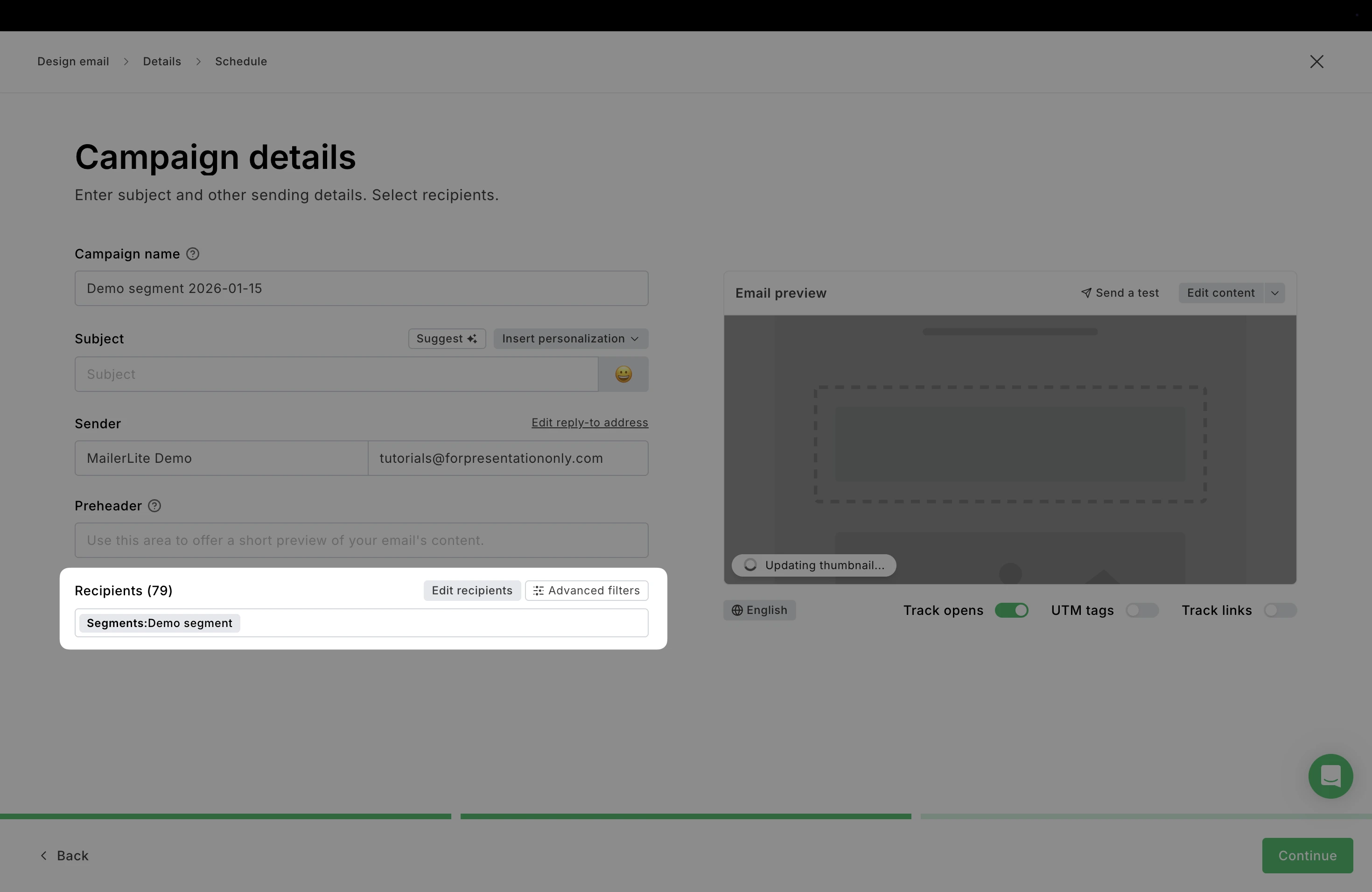 Once you are done editing and arrive on the Campaign details page, you will see your segment already added under Recipients.