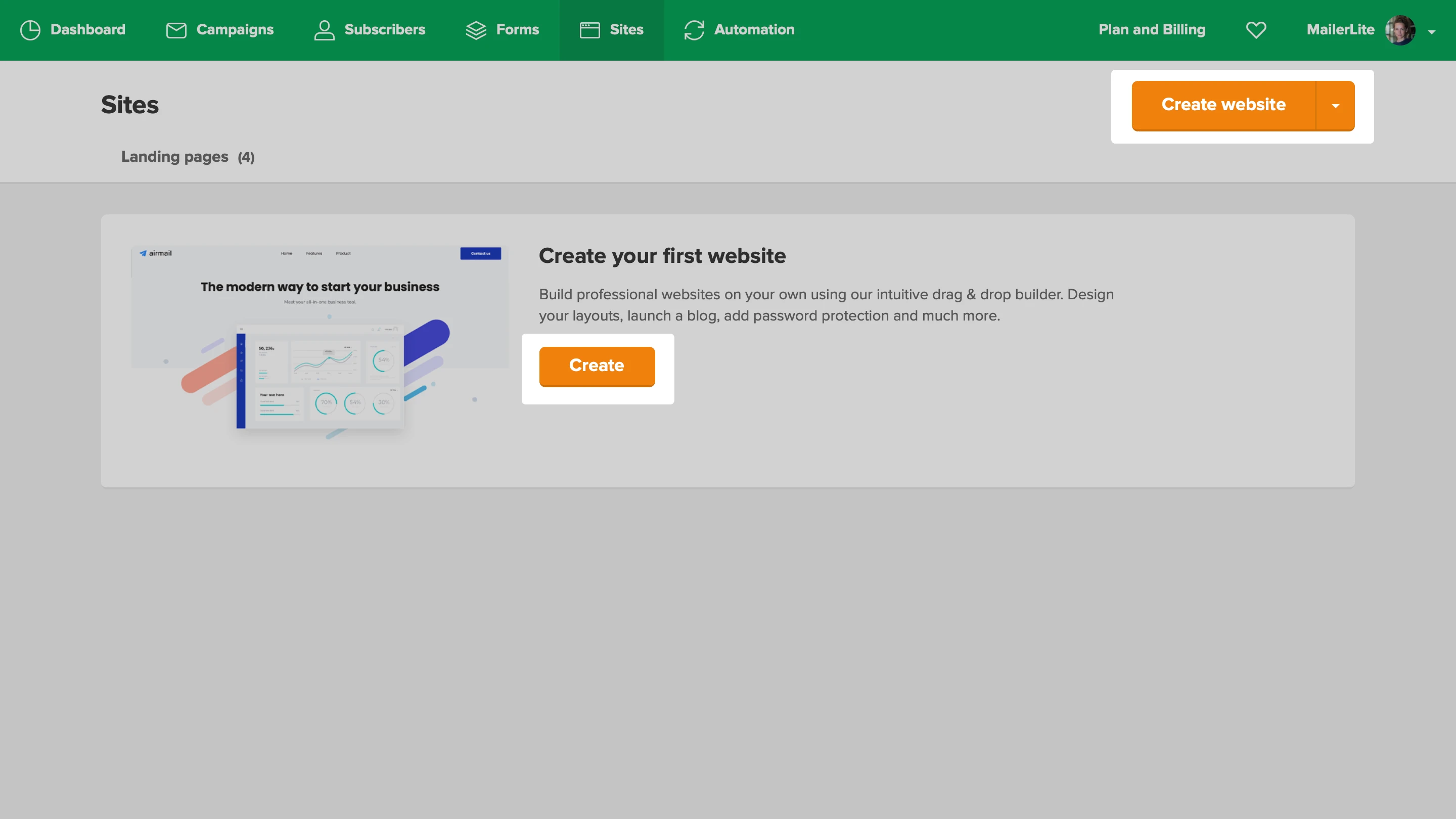 Websites are created on the Sites page under the Websites tab.