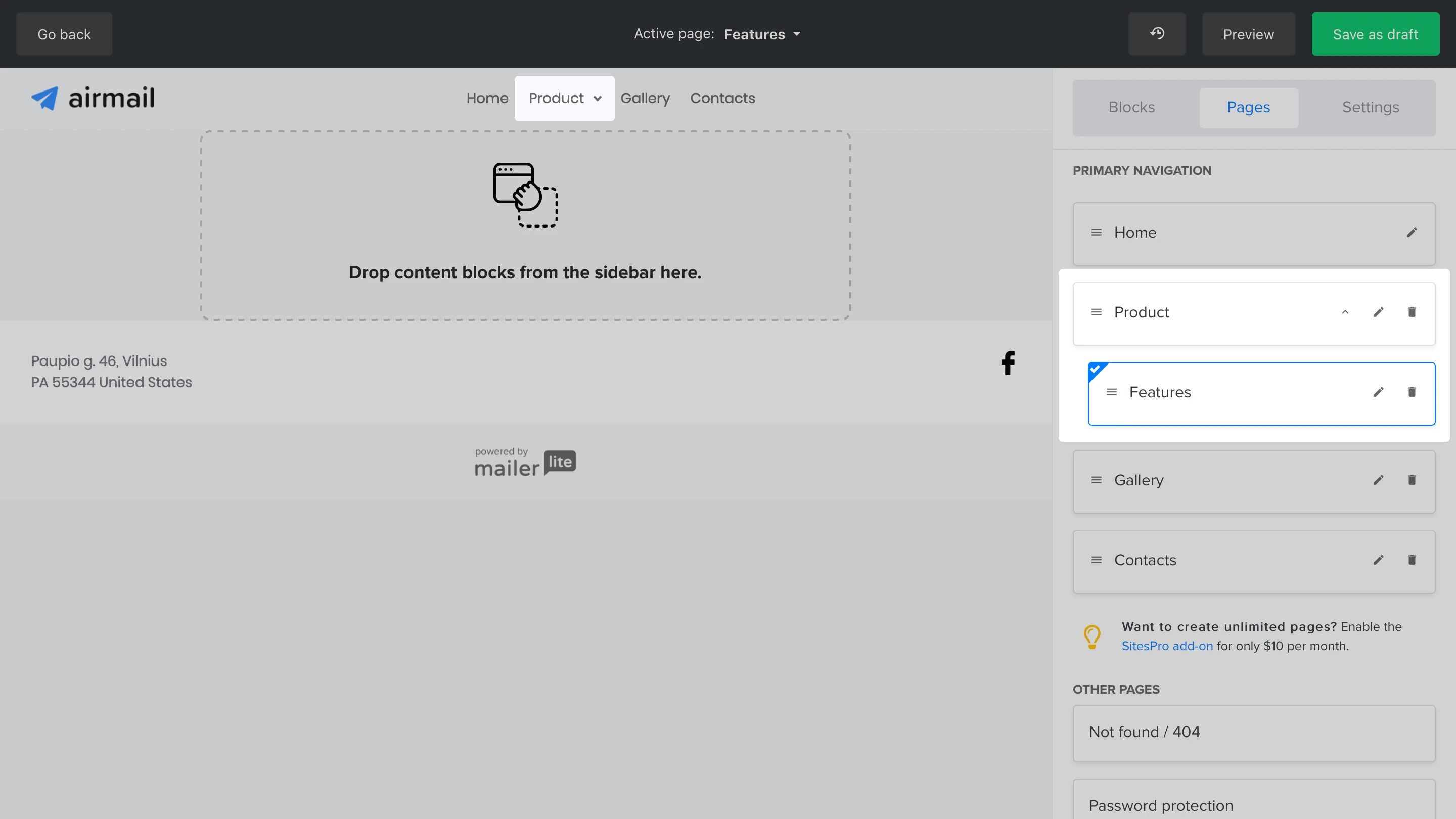 When a page is marked as a draft, its content is not accessible by the public. This is useful when you haven’t finished a page. Make sure to hide your draft pages from the navigation, so your visitors won’t get redirected to a 404-page.