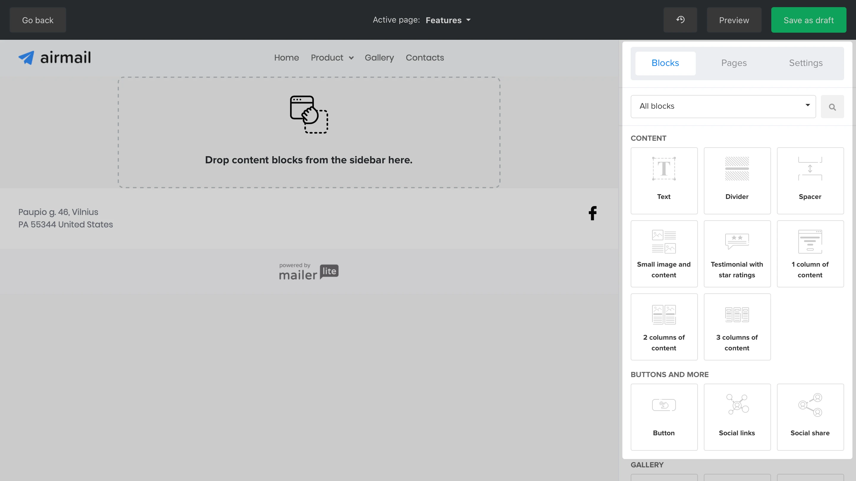 Drag and drop content blocks from the sidebar to build your website.