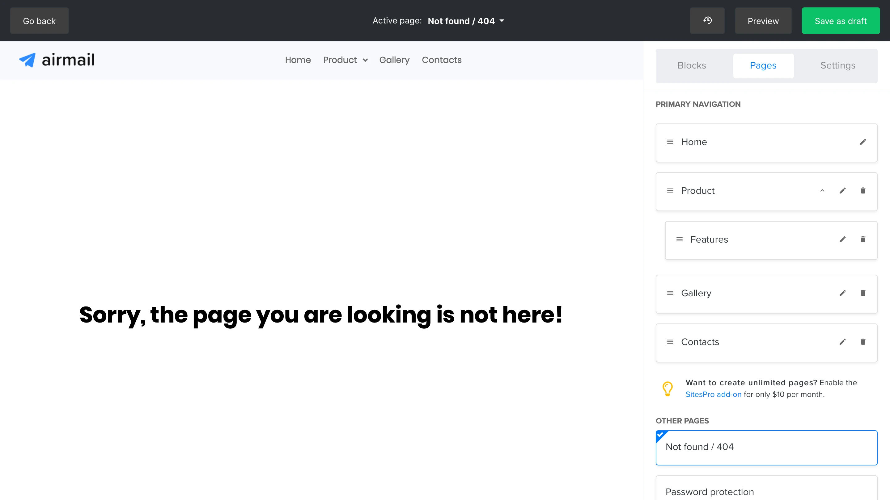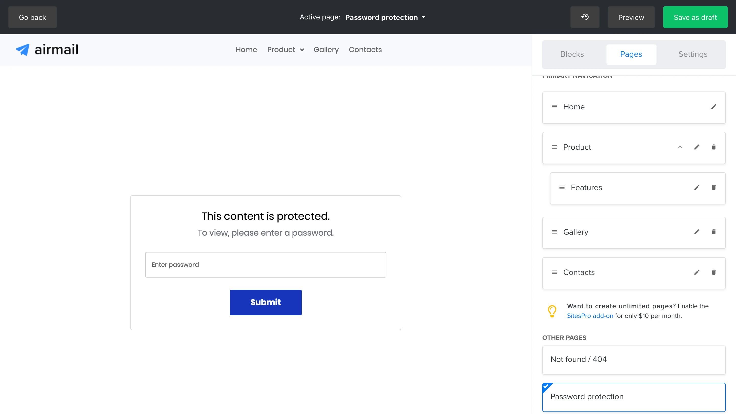 Every page can be protected with a password, meaning that the content of the page will only be accessible by entering a password that you’ve created.