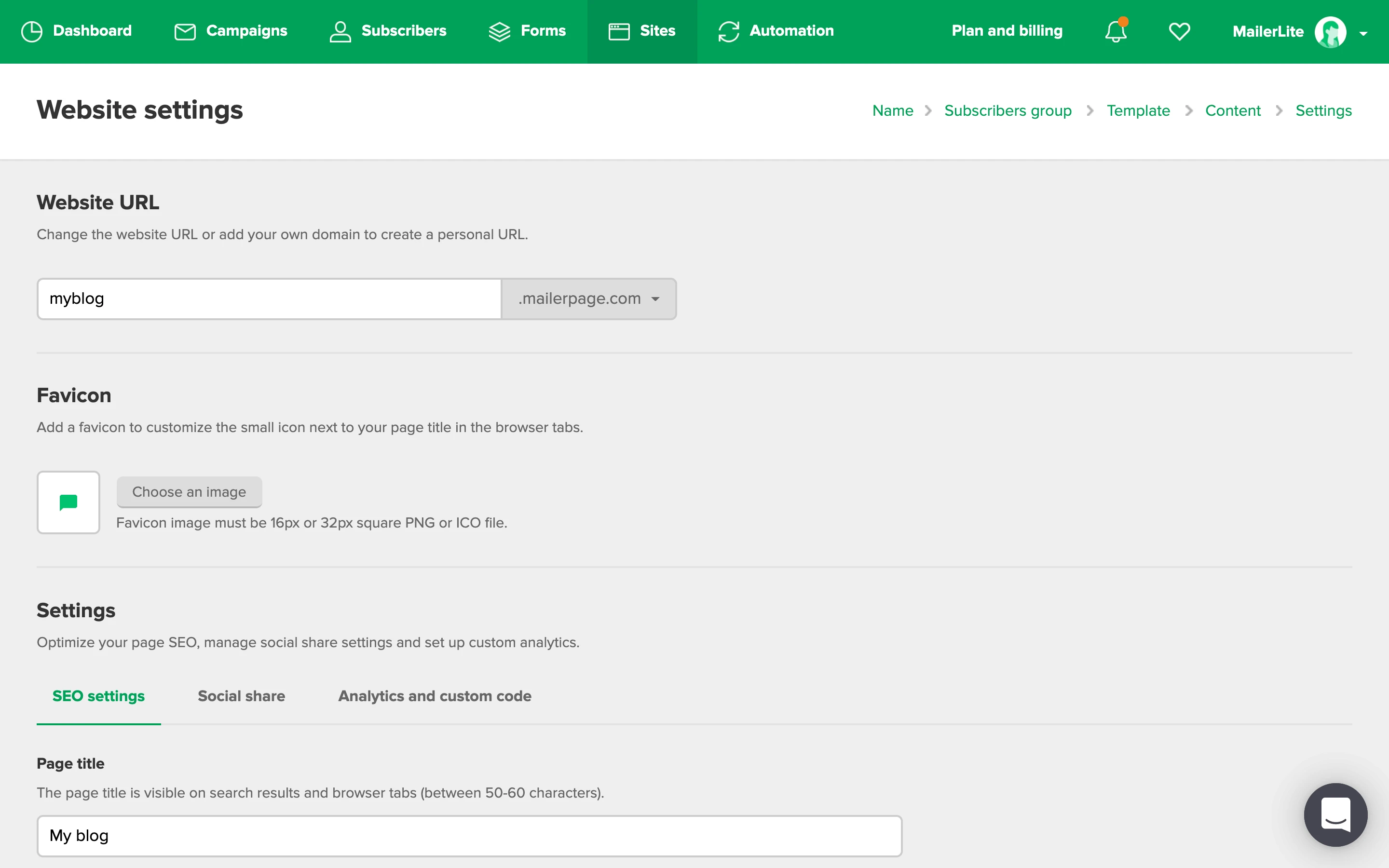On the Website settings page, you will need to add your website’s URL and favicon. For free plans, your URL will be on the mailerpage.io domain. You can enter whatever value to the URL field that suits your brand/business. Your website URL will then appear as example.mailerpage.io.