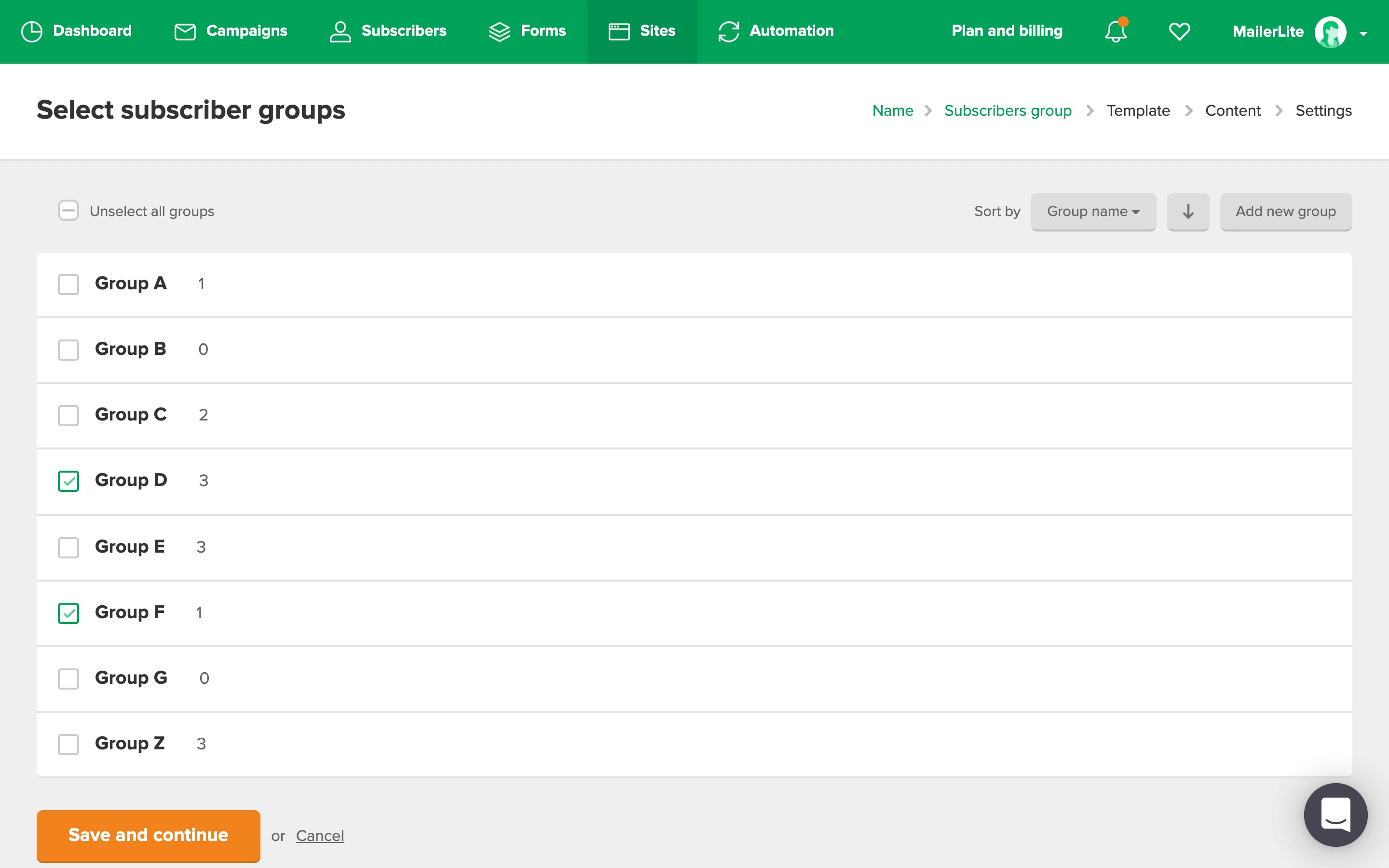 Select the groups you want to be associated with your website. These are the groups that will be attached to any forms you create within your website.