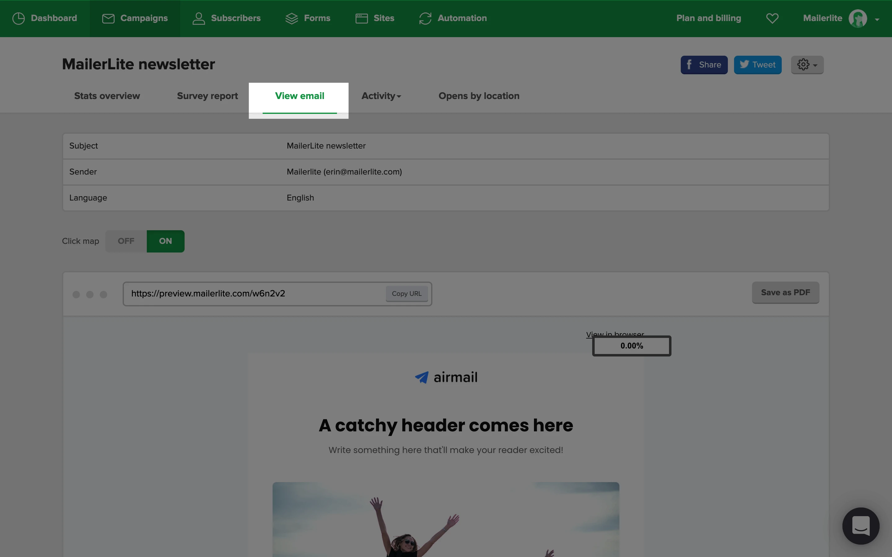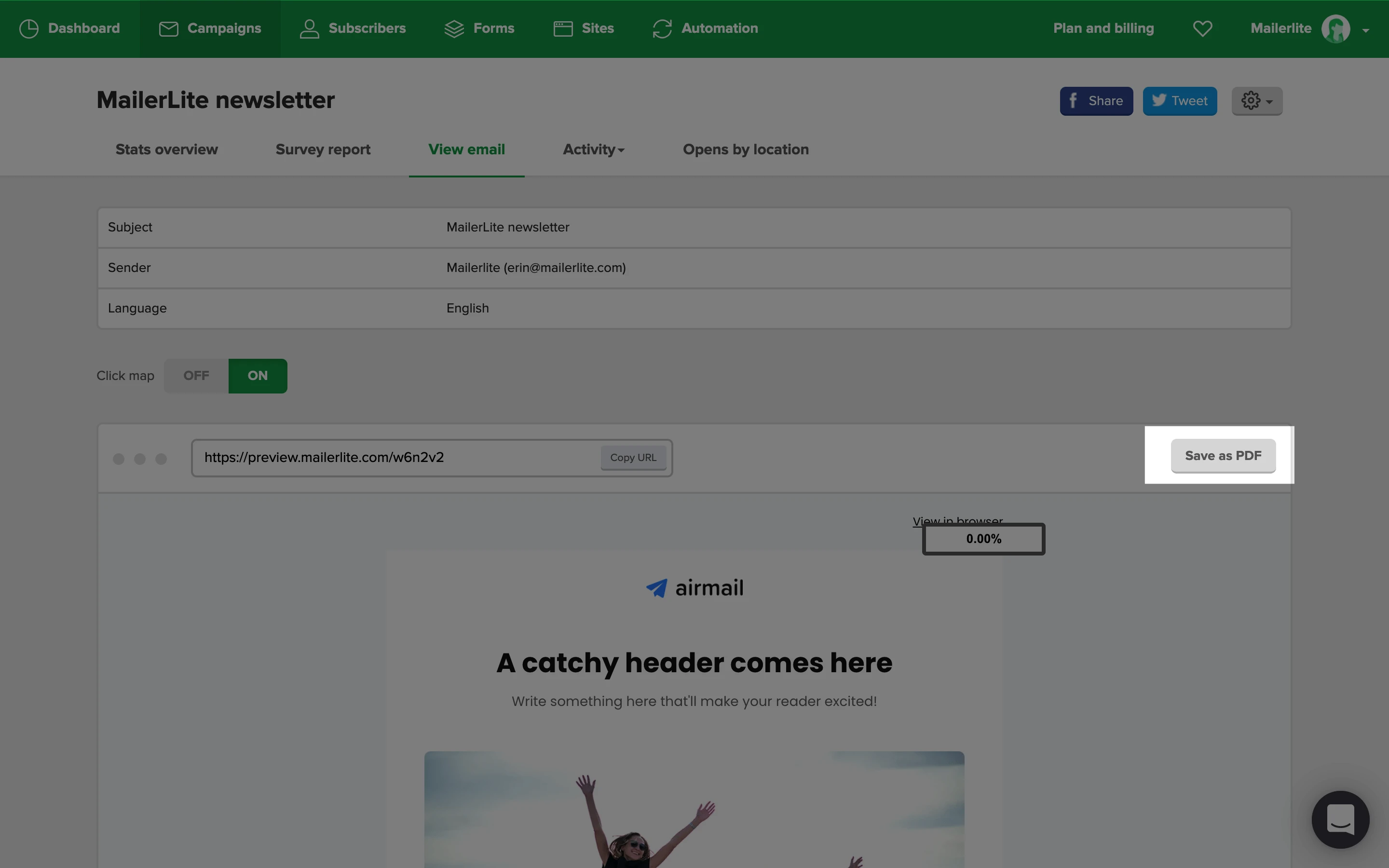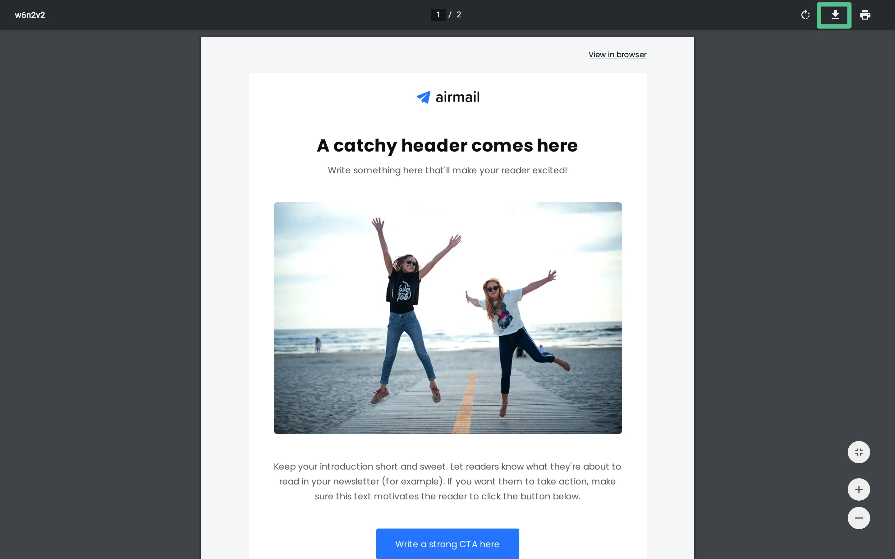 You can also find a Save as PDF button on the top-right corner of the page when viewing the preview version of your newsletter on the Drag and drop editor.
