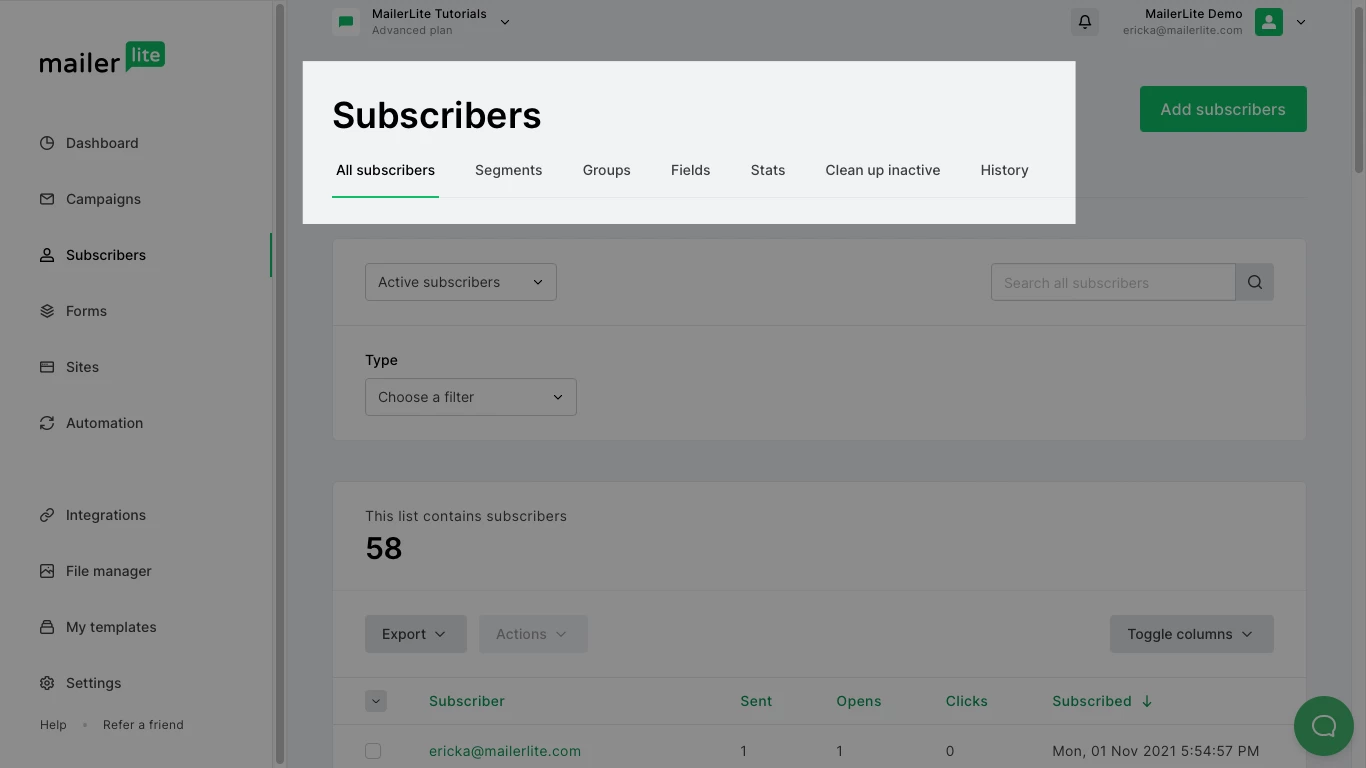 Once someone has successfully signed up to your email list, you can find them on the Subscribers page under the All subscribers tab.
