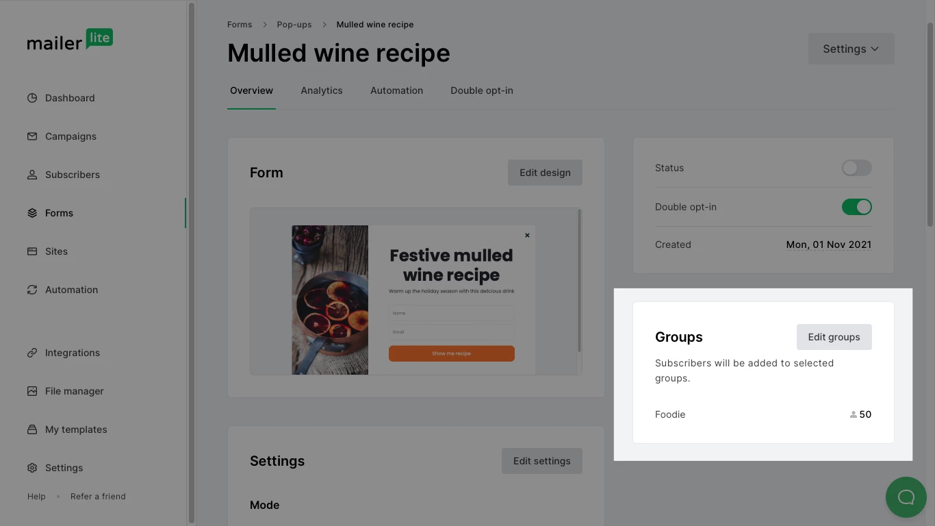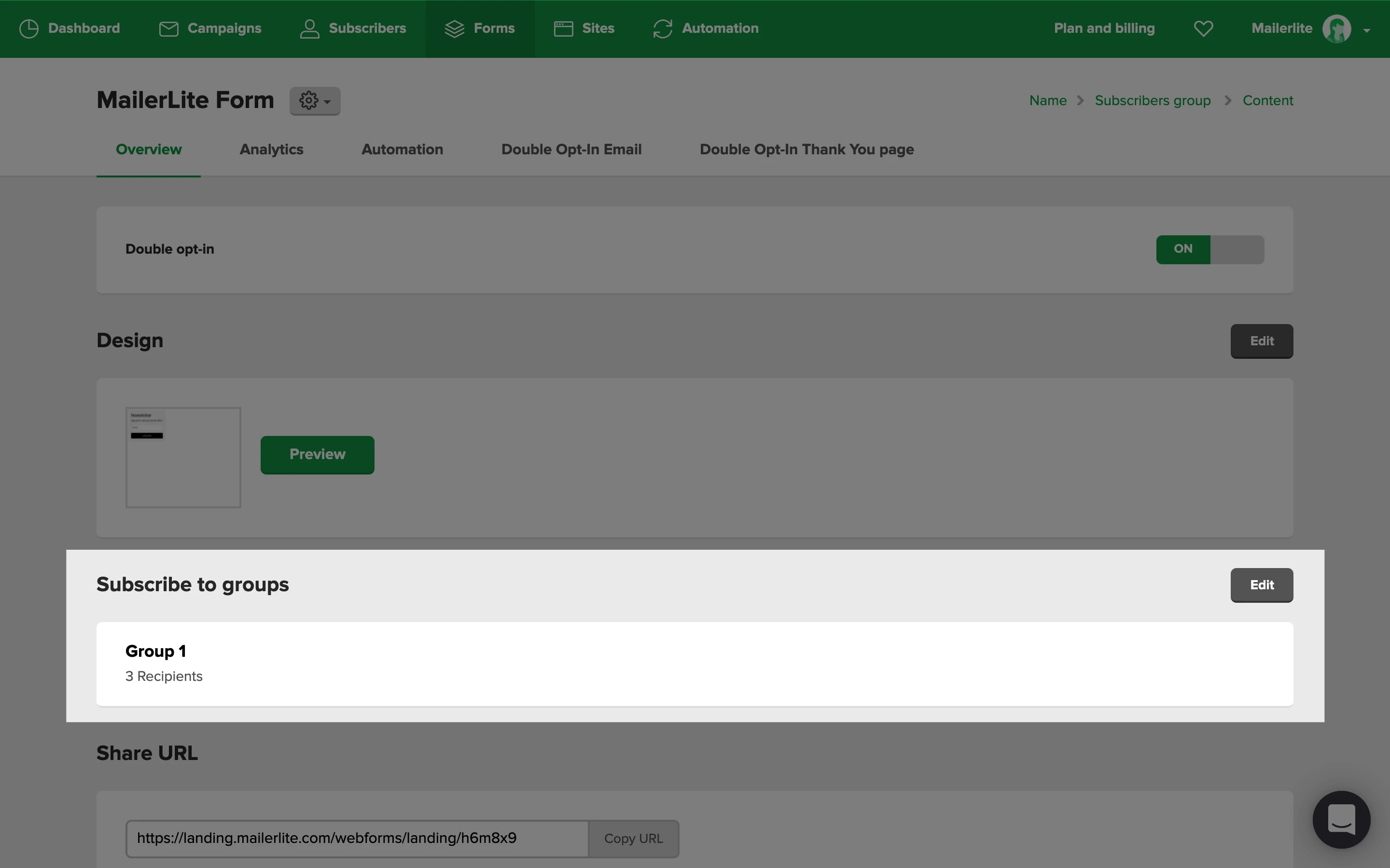 Navigate to the Forms (or the Sites page if you’re looking for landing page or website subscribers).