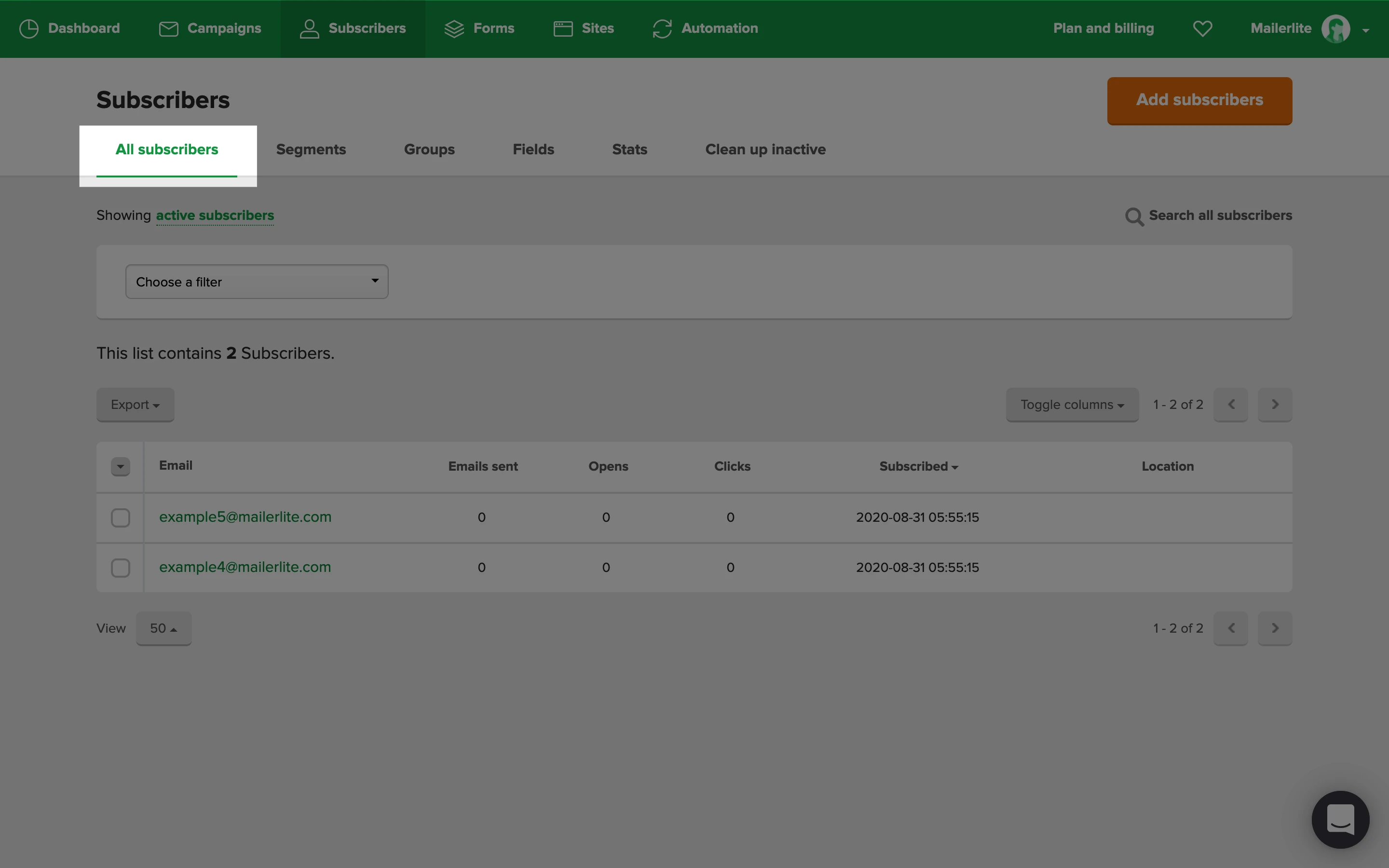 All subscribers that have been added to your subscriber list can be found on your Subscribers page under All subscribers.