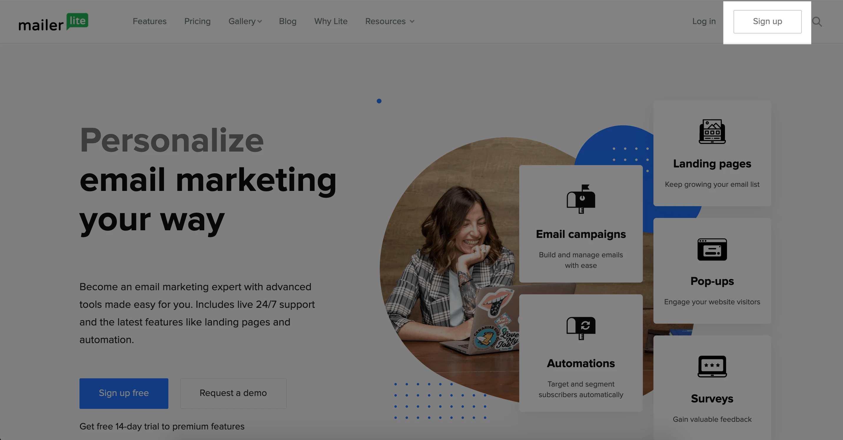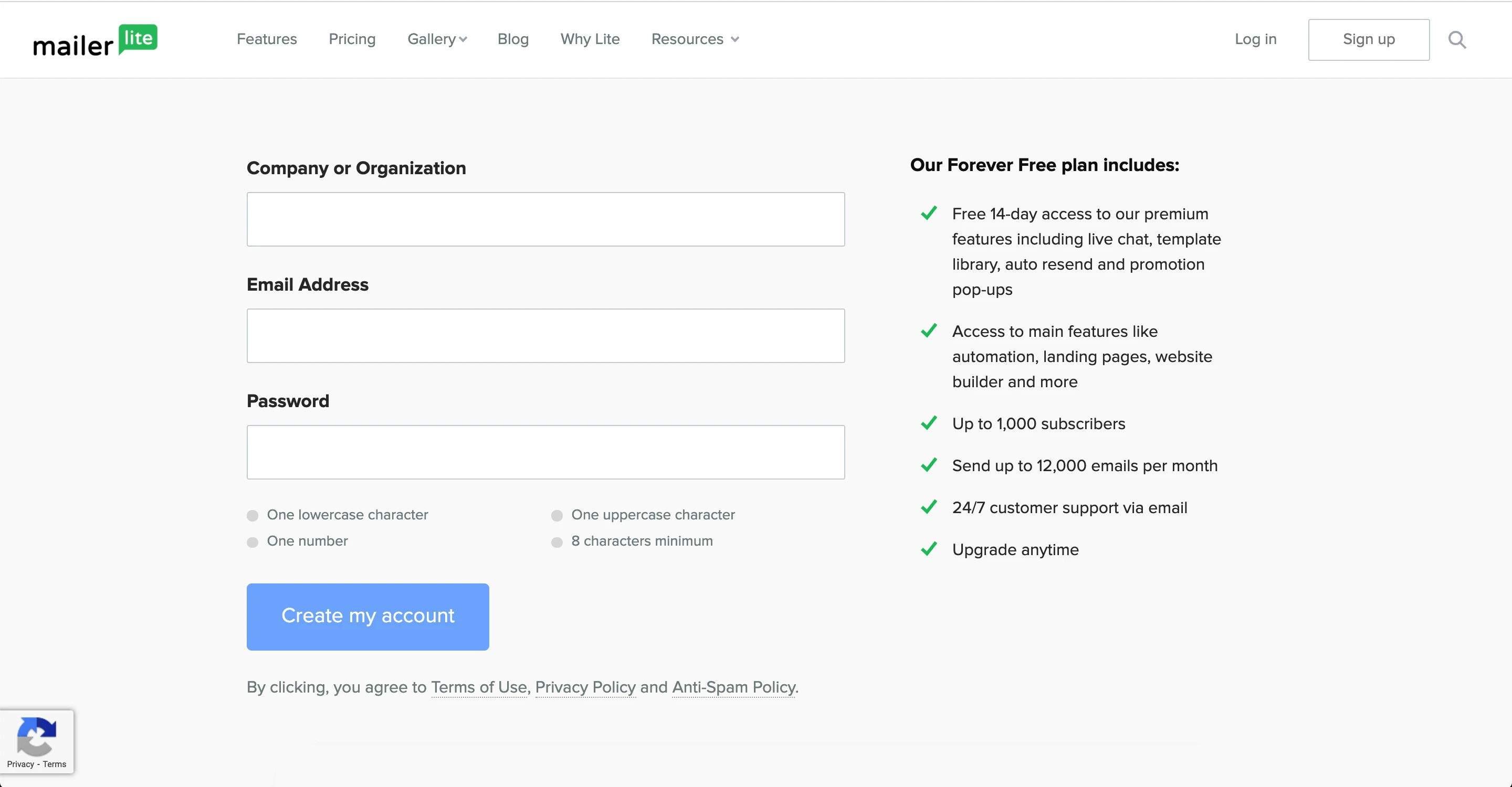 Anyone can sign up for a Forever Free plan by navigating to the MailerLite website and clicking the Sign up button.