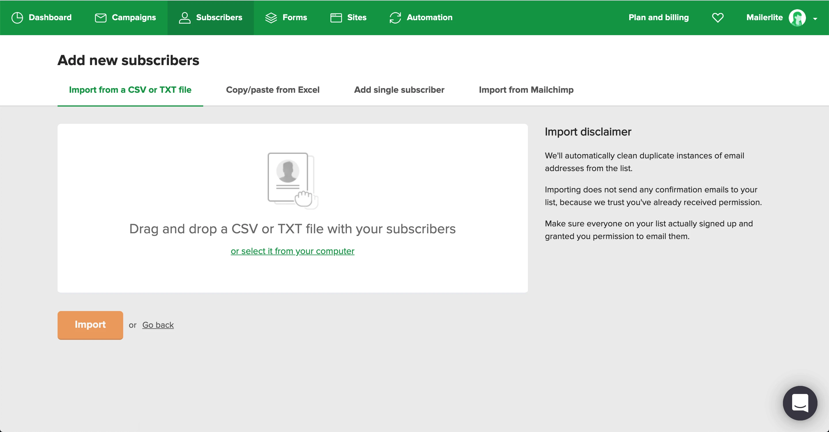 If you already have a list of subscribers, you’ll need to import them into your MailerLite account in order to send them newsletters.