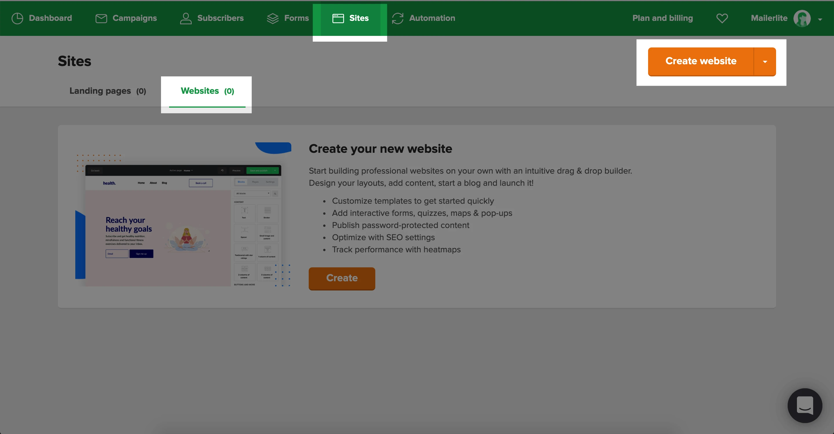 All MailerLite accounts can create and publish a five-page website using our website builder. Free accounts are limited to one, while accounts under the Growing Business or Advanced plan have unlimited websites.