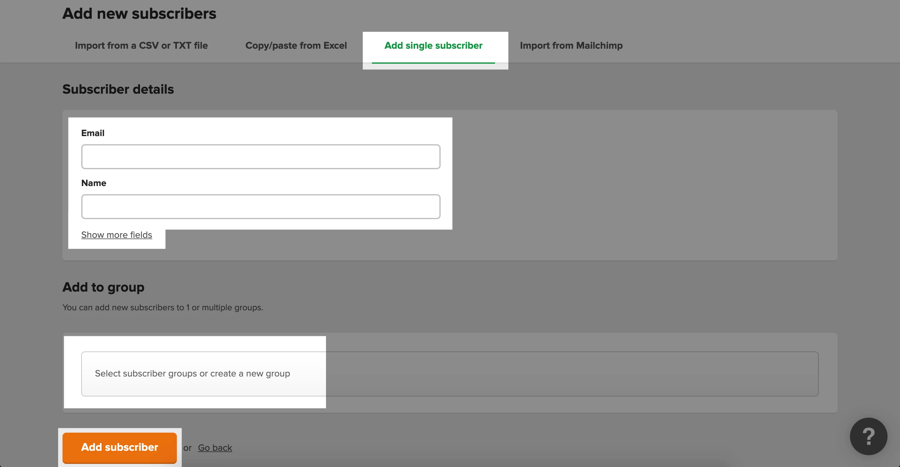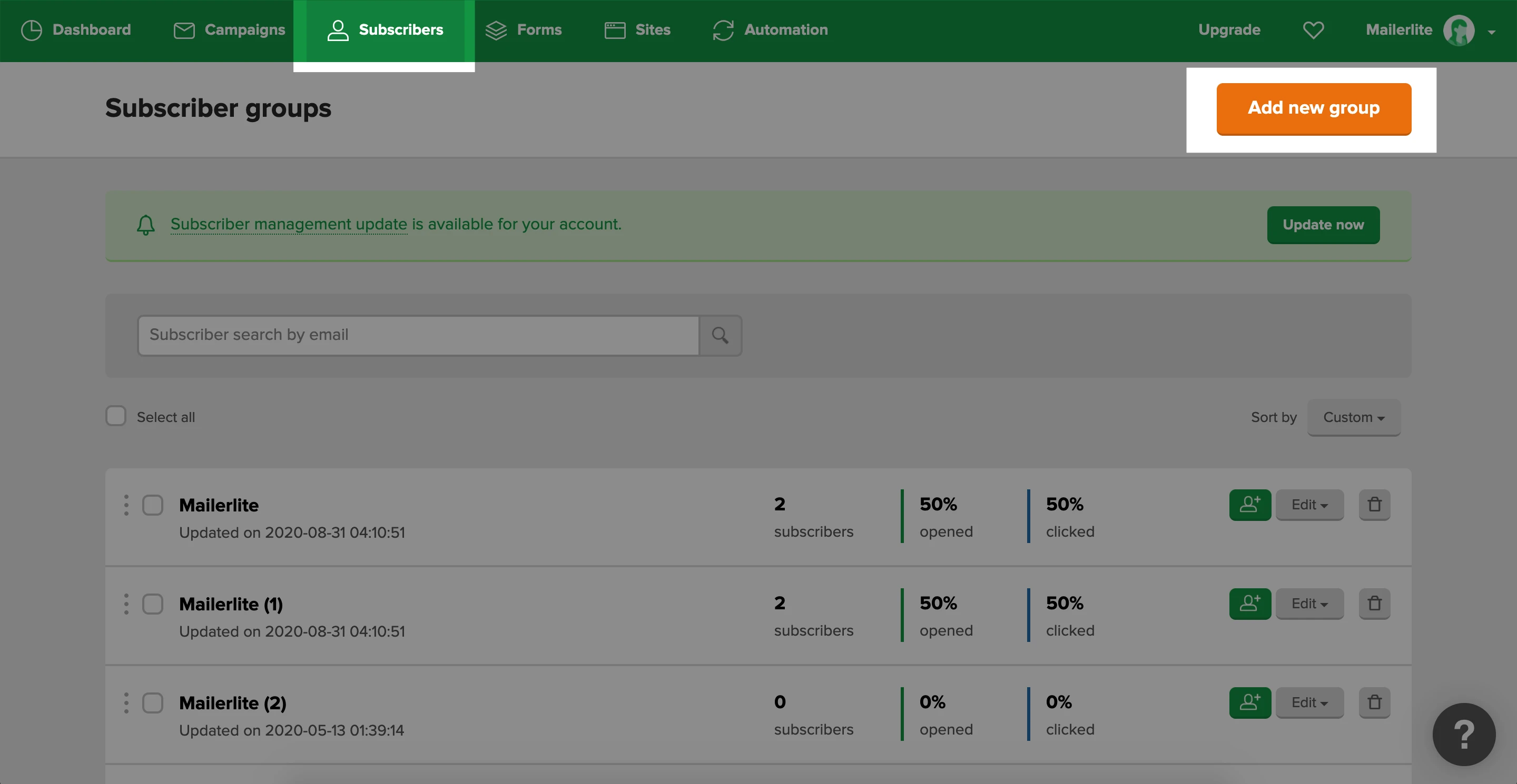 To add subscribers to a new group, first create it by clicking on the text box and type out the name of the new group. Then, click Add new group.