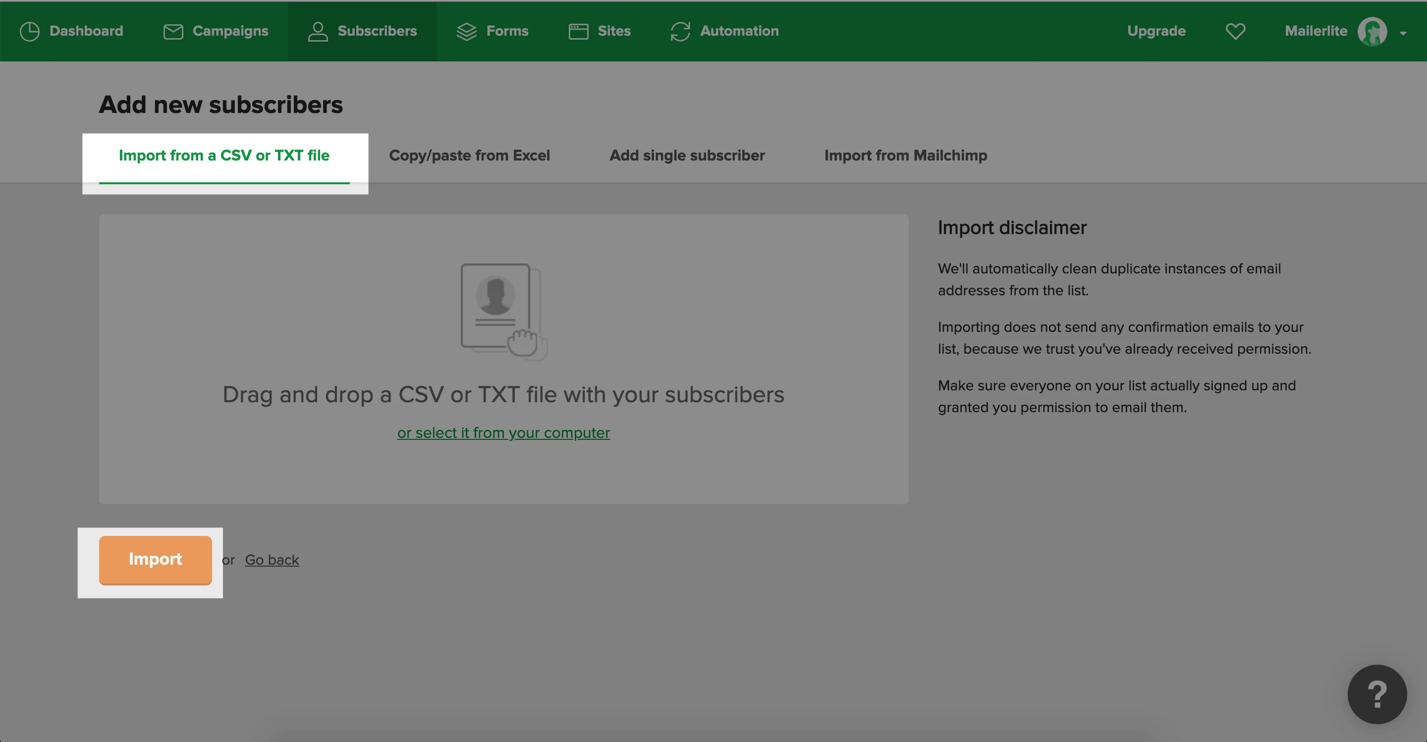 Directly from Mailchimp (read How to switch from Mailchimp to MailerLite)