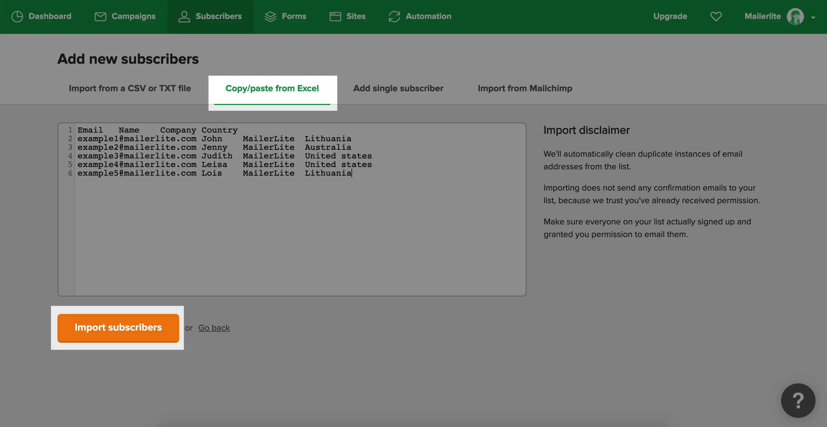 Copy all of the rows and columns on your Excel spreadsheet that you want to upload to your MailerLite subscriber list, then paste them into the text box.