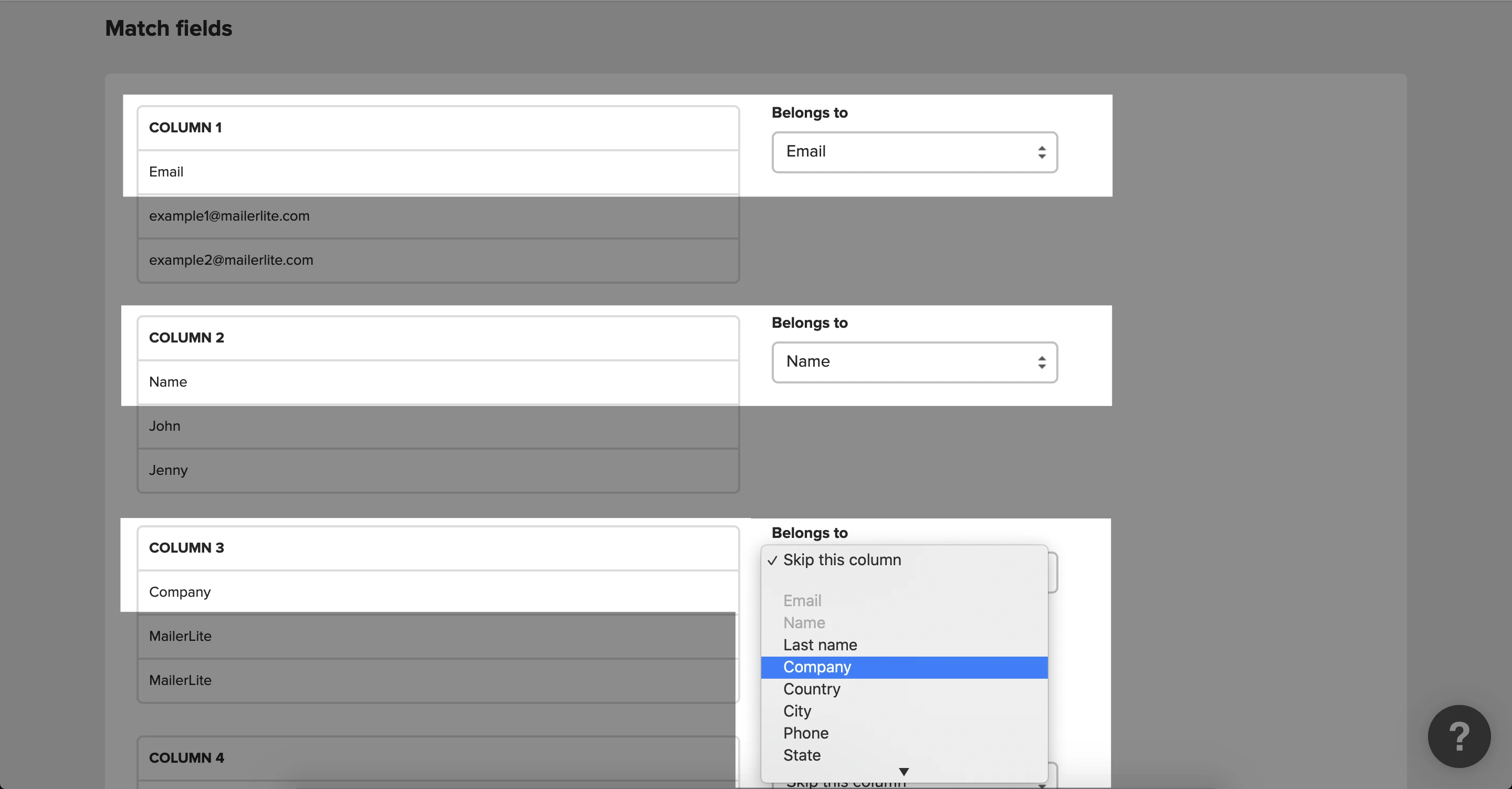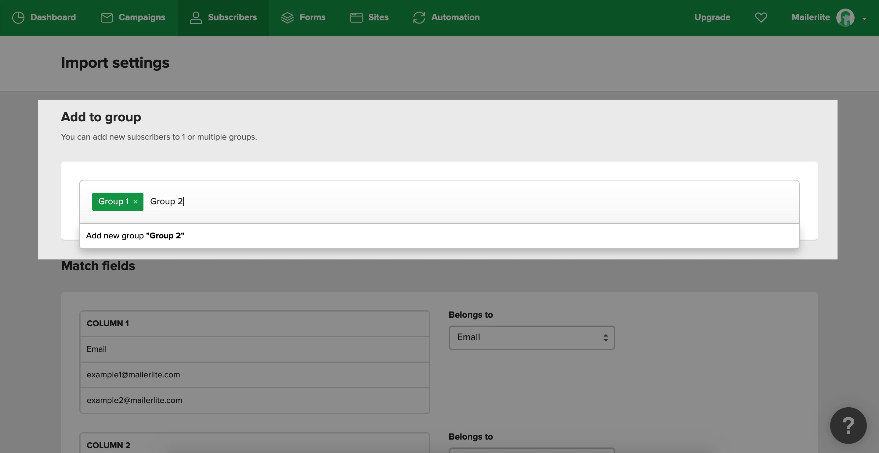 You’ll proceed to choose which group(s) to add your subscribers, and to match the columns in your spreadsheet to the fields in your MailerLite subscriber list.