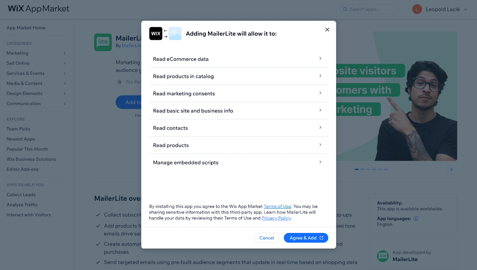 6. Accept the WixMarket Terms by clicking Agree & Add.
