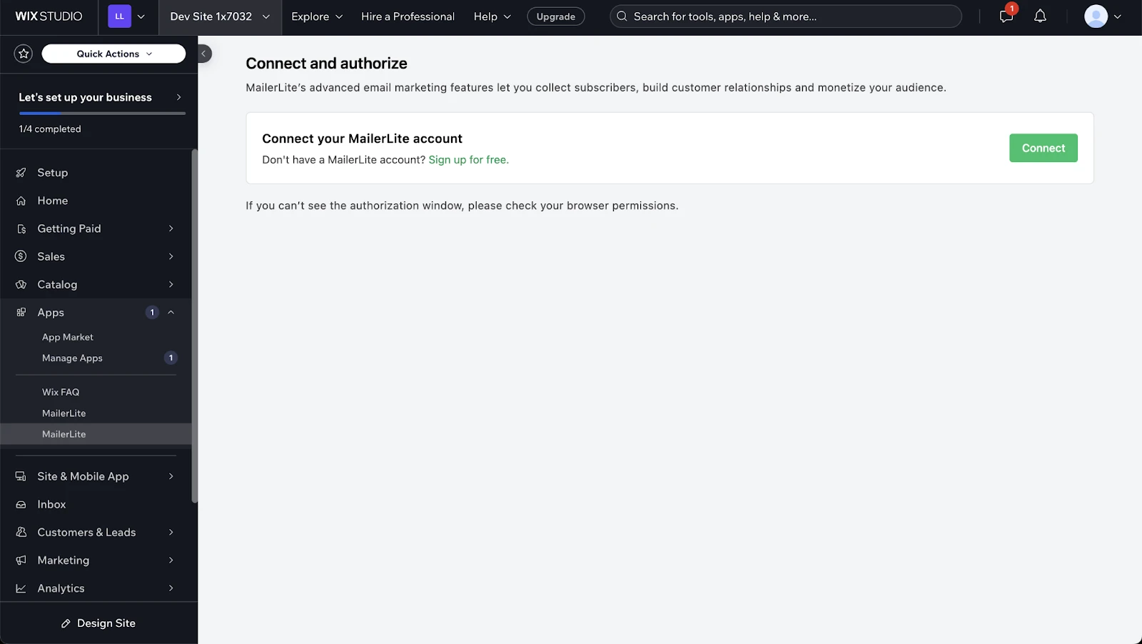 7. You will be asked to Authorize your account and allow the connection with Wix. Click Connect to sign into your MailerLite account.