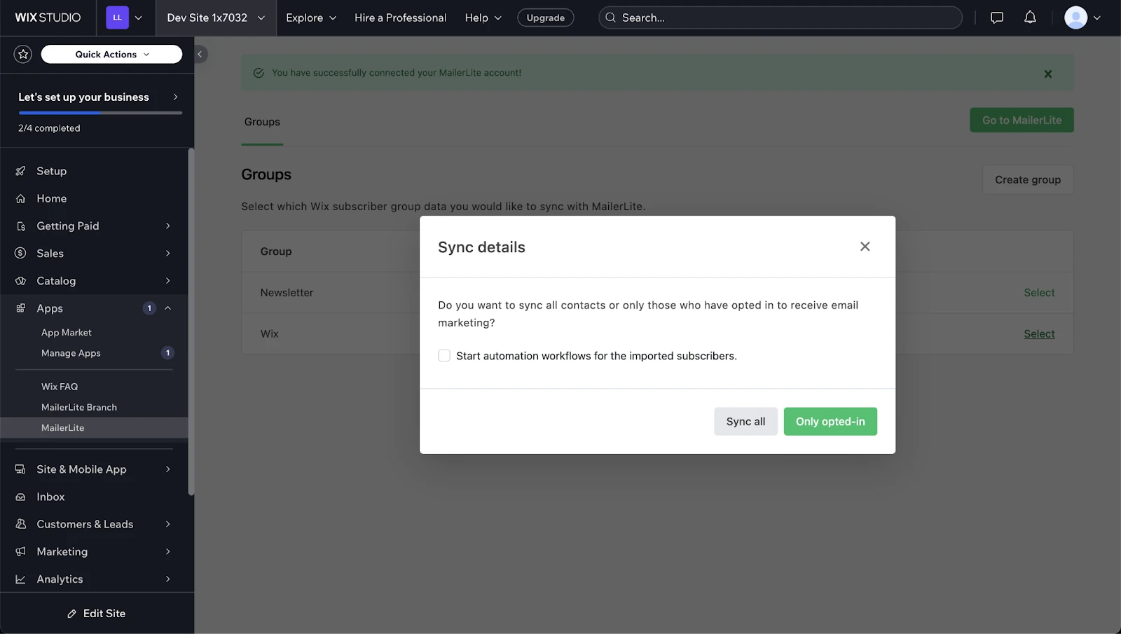 Once you select your subscriber group, a pop-up will appear in which you can select to sync all Wix customers to that group or only the Wix customers that have accepted marketing permissions.