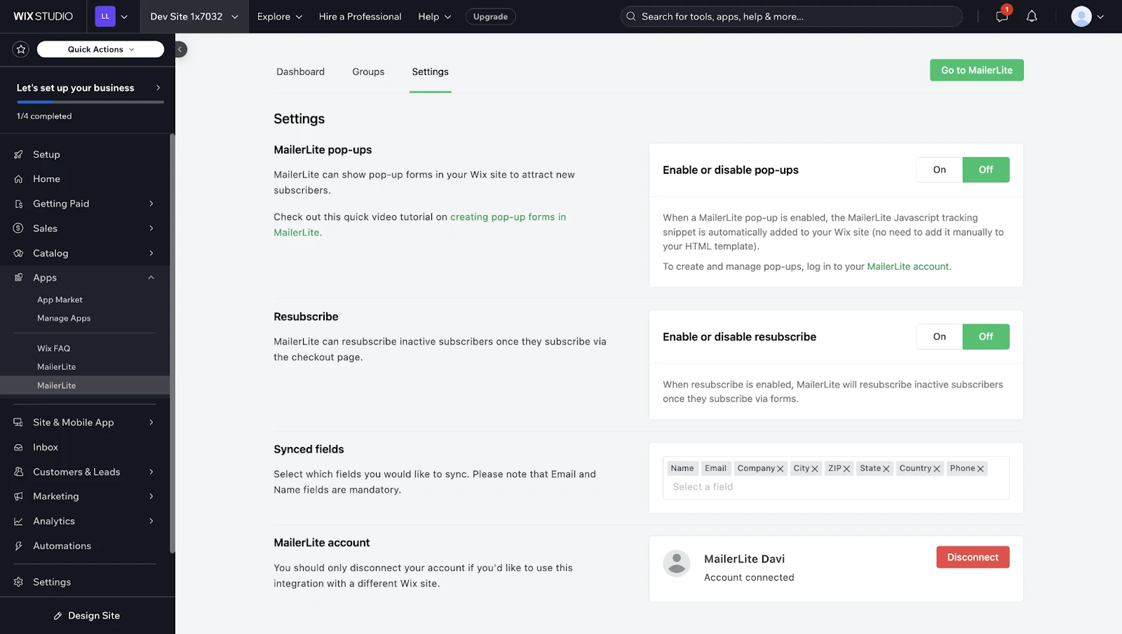 MailerLite account: Check the connected MailerLite account, as well as the option to Disconnect from Wix.