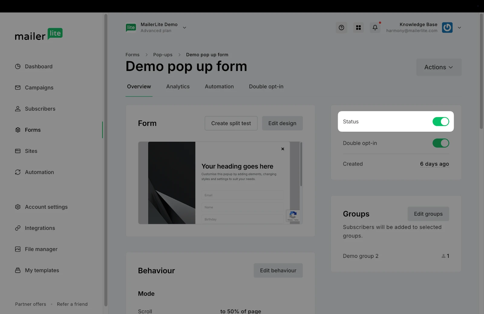 To add a MailerLite pop-up form to your Wix site, be sure to create the form in your MailerLite account first, and that the Status is ON.