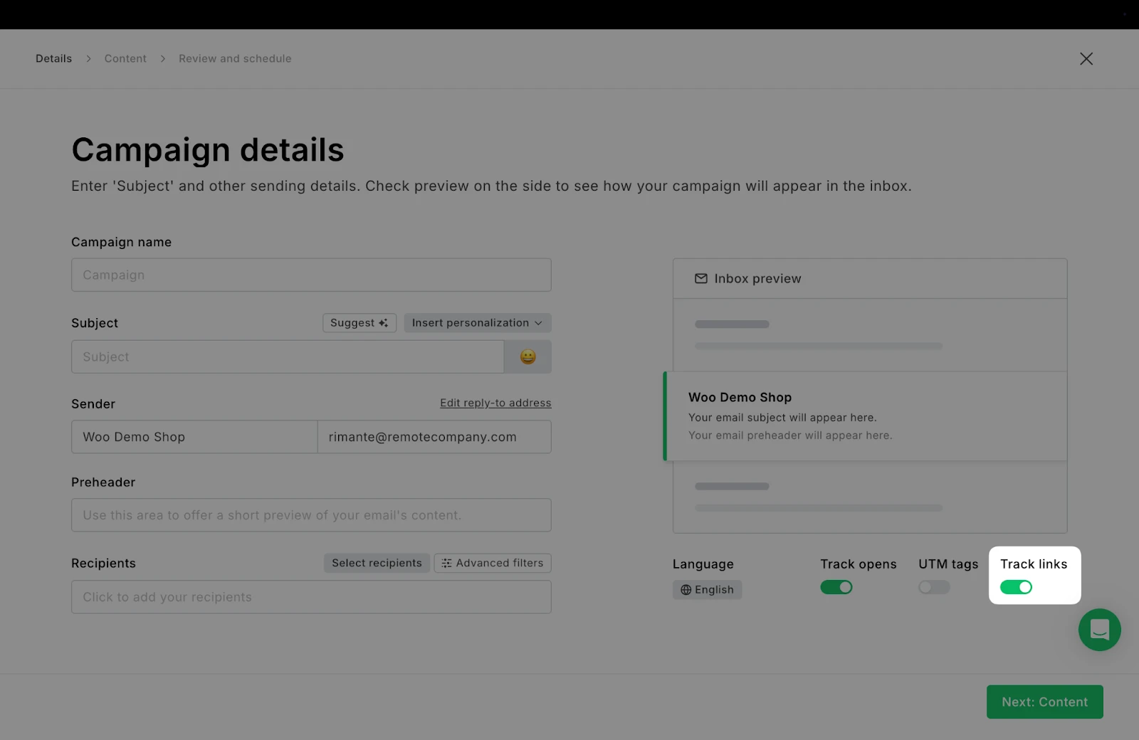 Be sure to toggle ON the option to Track links. This ensures that any purchases made through e-commerce blocks in your campaigns are tracked by MailerLite.
