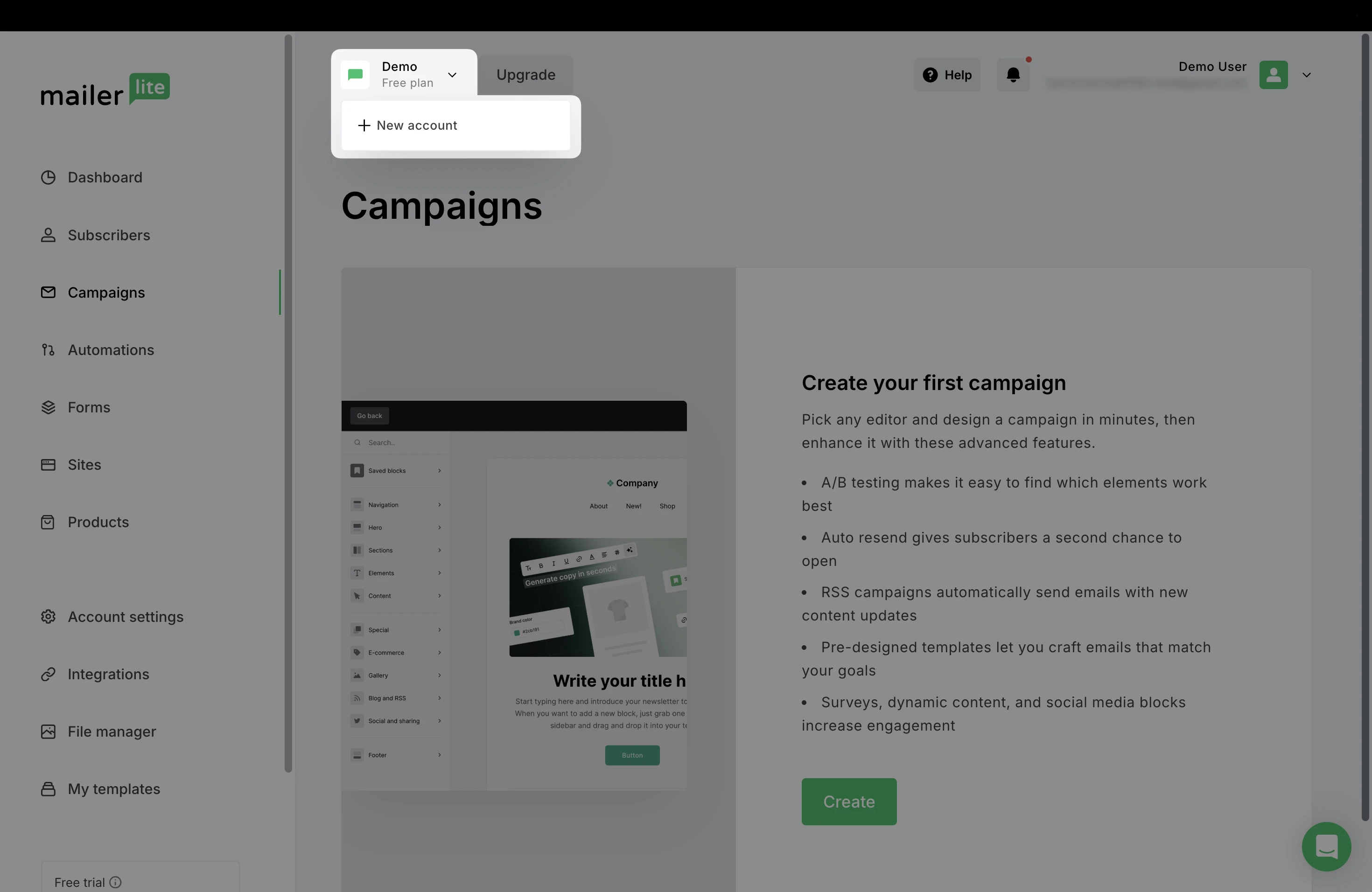 You will then be prompted to go through the onboarding process for all new accounts. For more info on newly created accounts, see our guide: How to create a MailerLite account