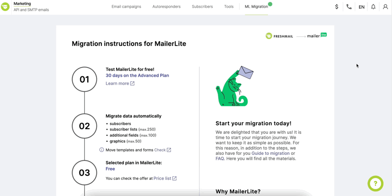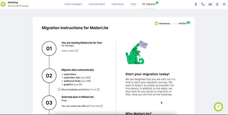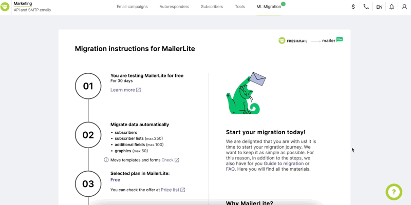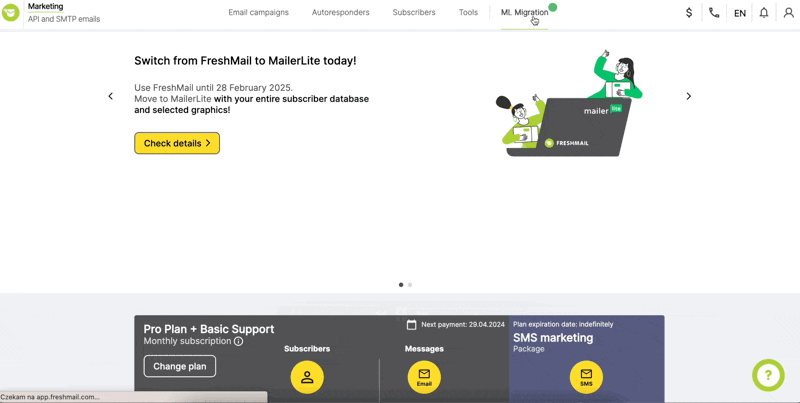 If you would like to switch to MailerLite without using up the messages you have bought in FreshMail, contact us at migracja@freshmail.pl. Our specialists will help you transfer the unused part of your plan to MailerLite. The unused amount from your subscription will be converted into monetary funds (so-called MailerLite credits) and added to your MailerLite account. You can then use these funds when making your next payment to buy a MailerLite plan cheaper.