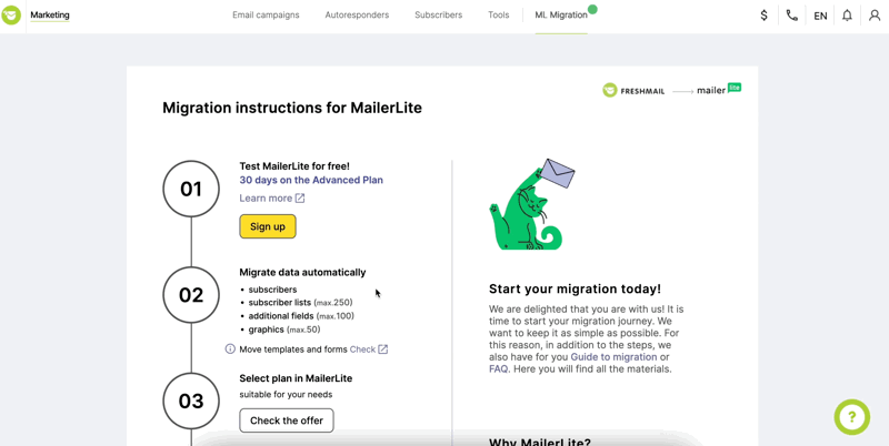 Do you use FreshMail but want to continue your email marketing in MailerLite? That’s an excellent idea! MailerLite gives you even more possibilities! From AI-based tools to multivariete testing options and advanced automation paths.