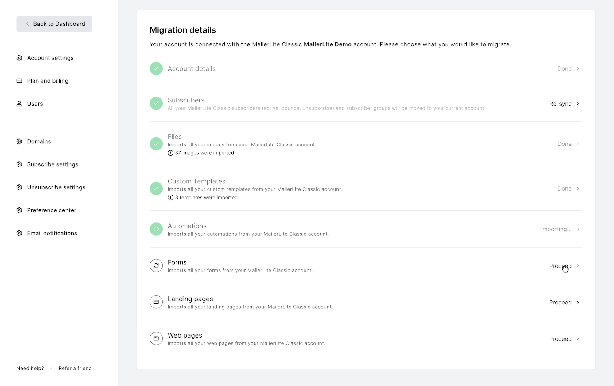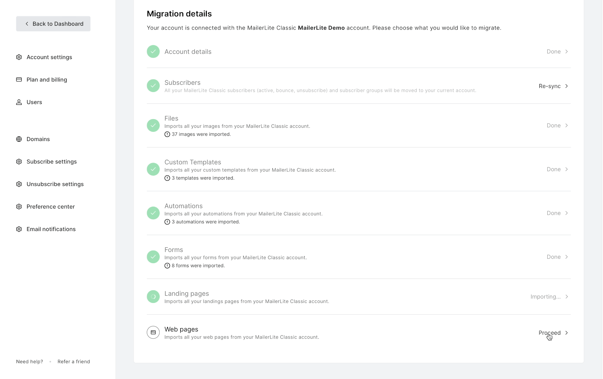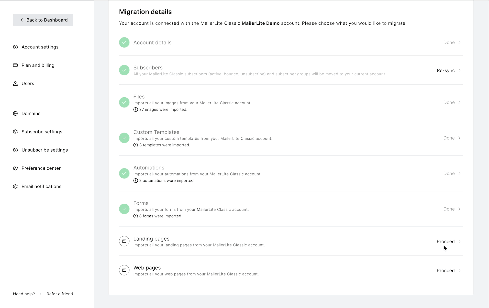If you're still collecting and managing subscribers in MailerLite Classic, you can always come back to the Migration tab in your Account Settings to re-sync subscribers whenever you need to.