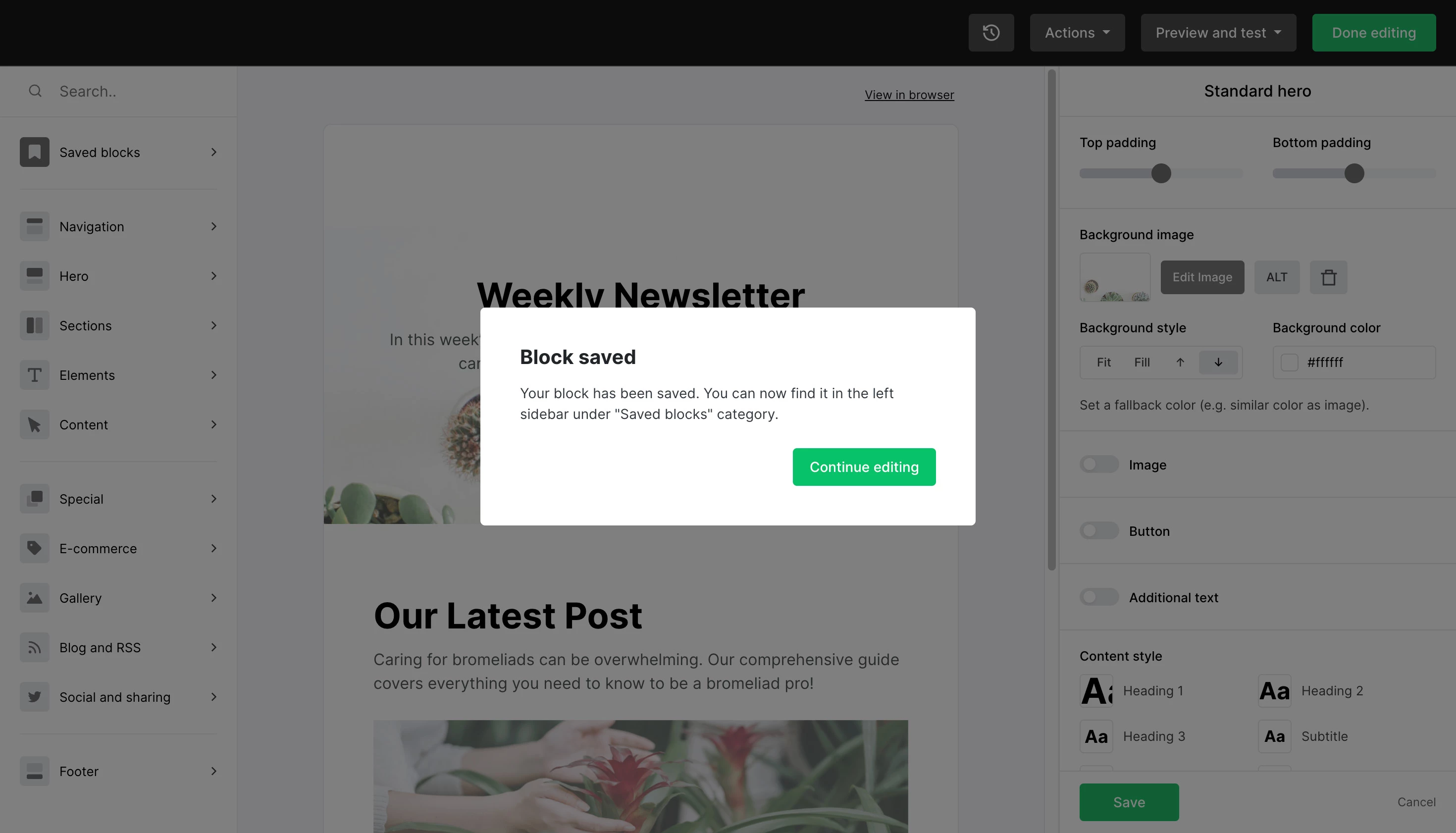 6. A confirmation message will appear if the block was saved successfully. Click Continue editing to return to the drag & drop editor.