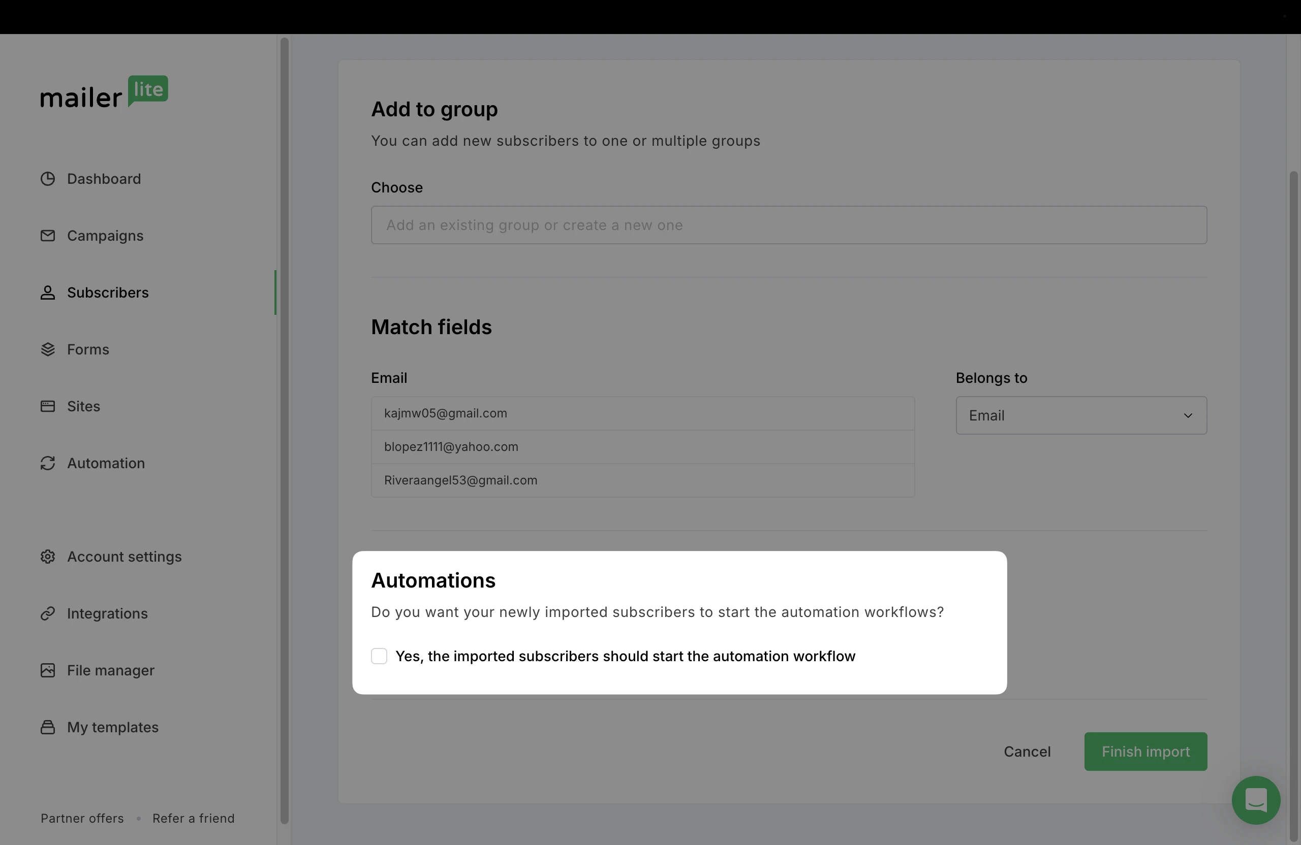 Adding subscribers with valid field data via CSV or TXT file will only trigger an automation if the following option is checked during the import: