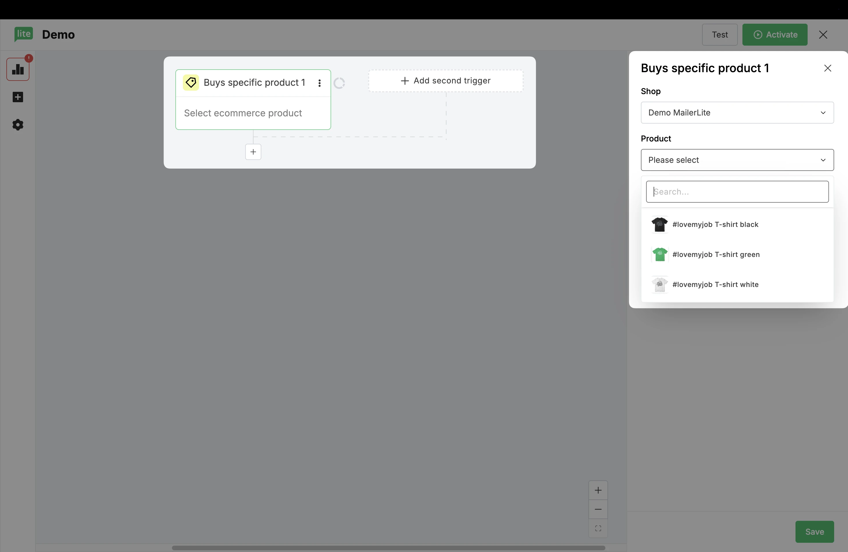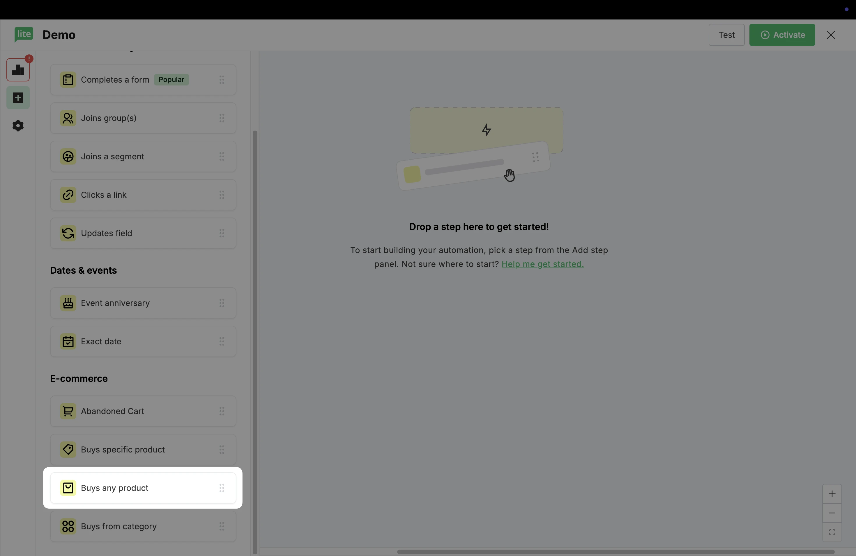 In the sidebar in the Triggers tab, scroll down to the E-commerce automation triggers. Select the workflow trigger Buys specific product.