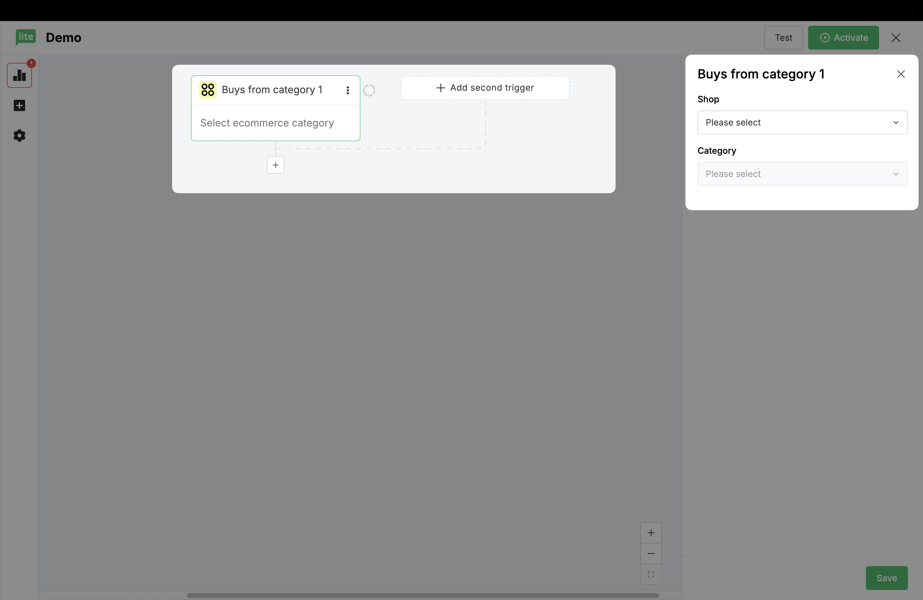 When you select the trigger Buys from category, the automation workflow will trigger when a subscriber purchases any product from a category that you specify.Â