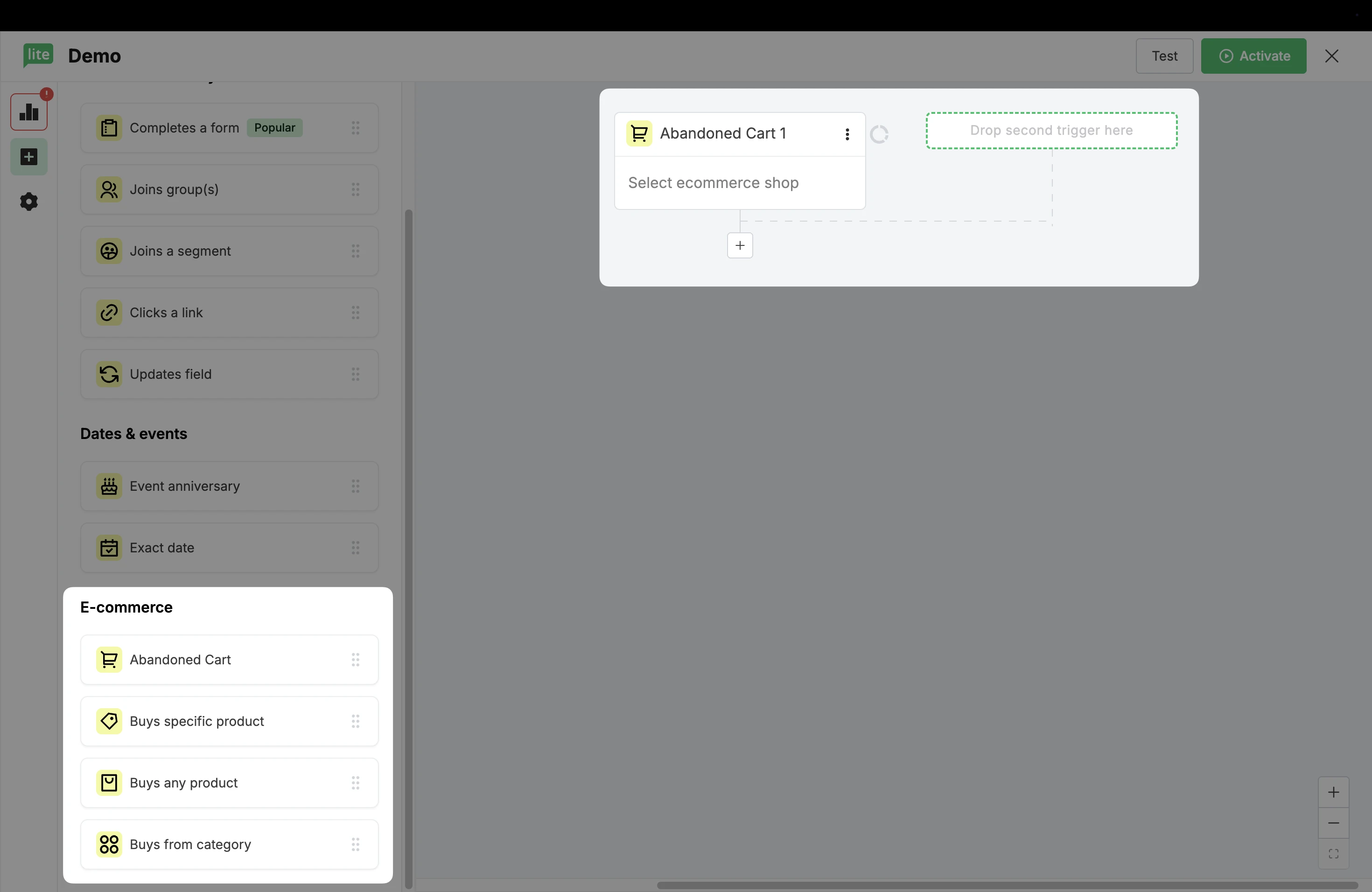 In the sidebar in the Triggers tab, scroll down to the E-commerce automation triggers.