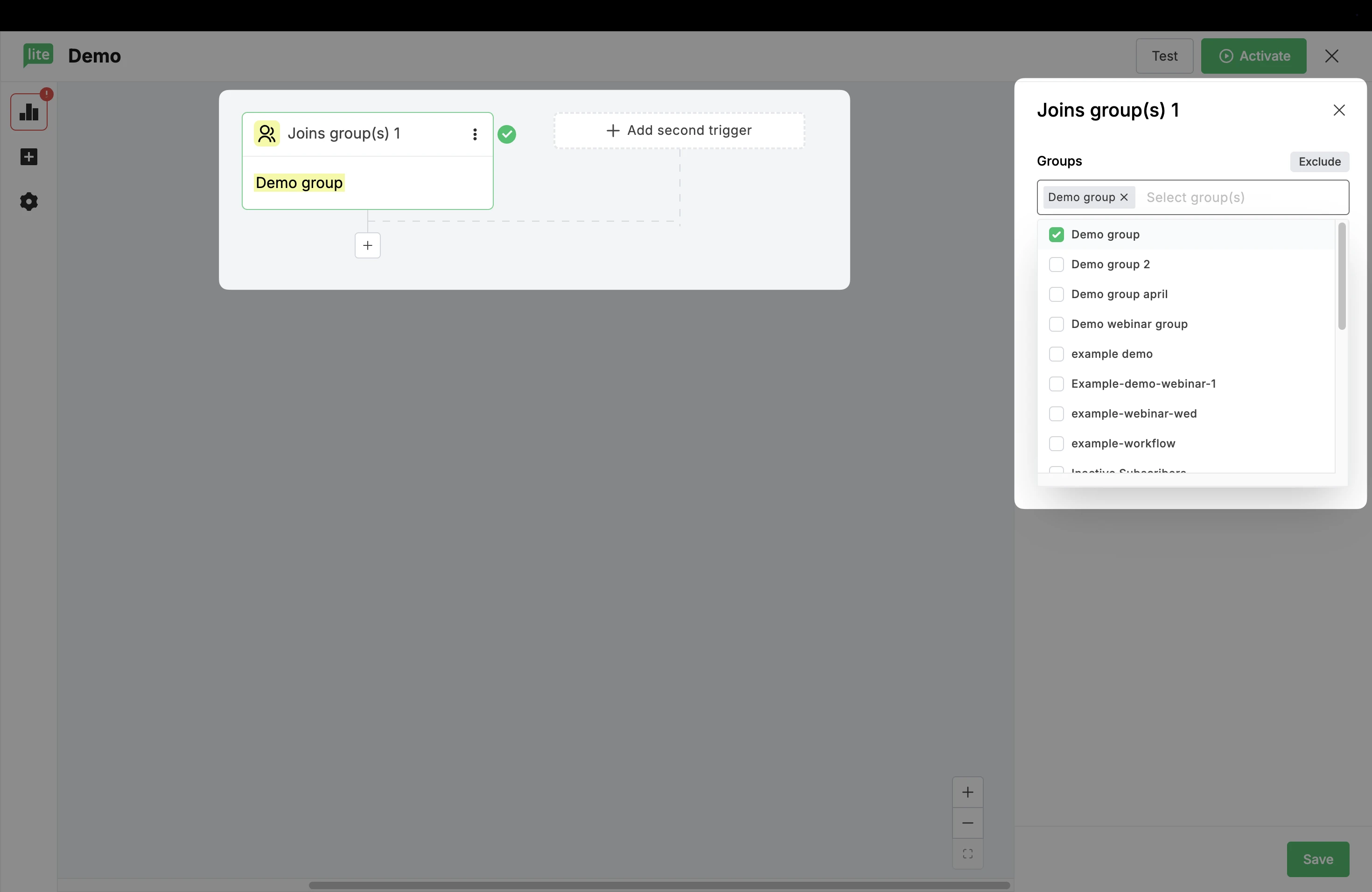 In the sidebar under Groups, select which group you want to trigger the workflow when it's joined. Alternatively, click Exclude to prohibit certain groups from entering the automation. create a group specifically for this automation.