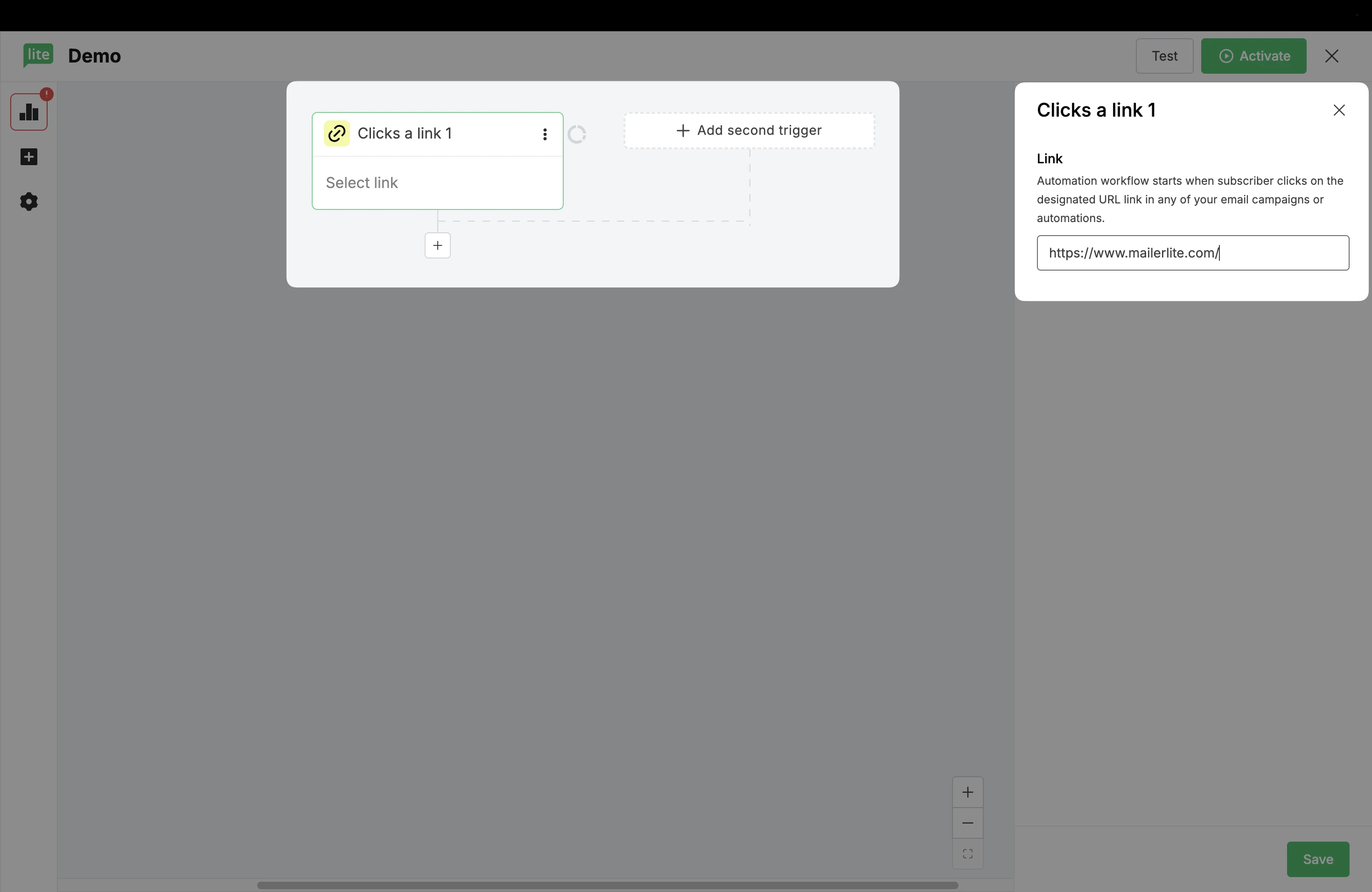When you set your workflow trigger to Clicks a link, the workflow will be triggered when a subscriber clicks a specific link in any MailerLite automation email or campaign.