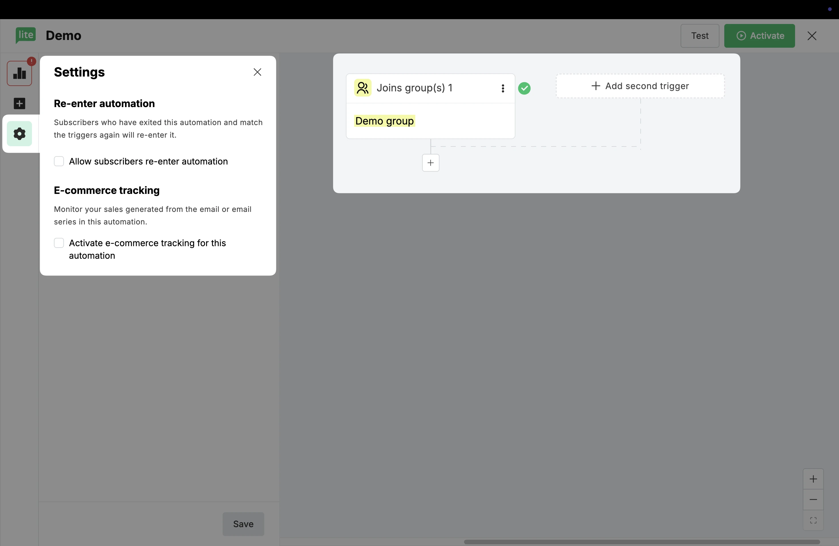3. In the left sidebar in the Settings tab, you’ll see an option a labeled Allow subscribers re-enter automation. Check this box if you want subscribers to re-trigger the workflow every time they rejoin the trigger group. However, subscribers can only be triggered once every 24 hours.