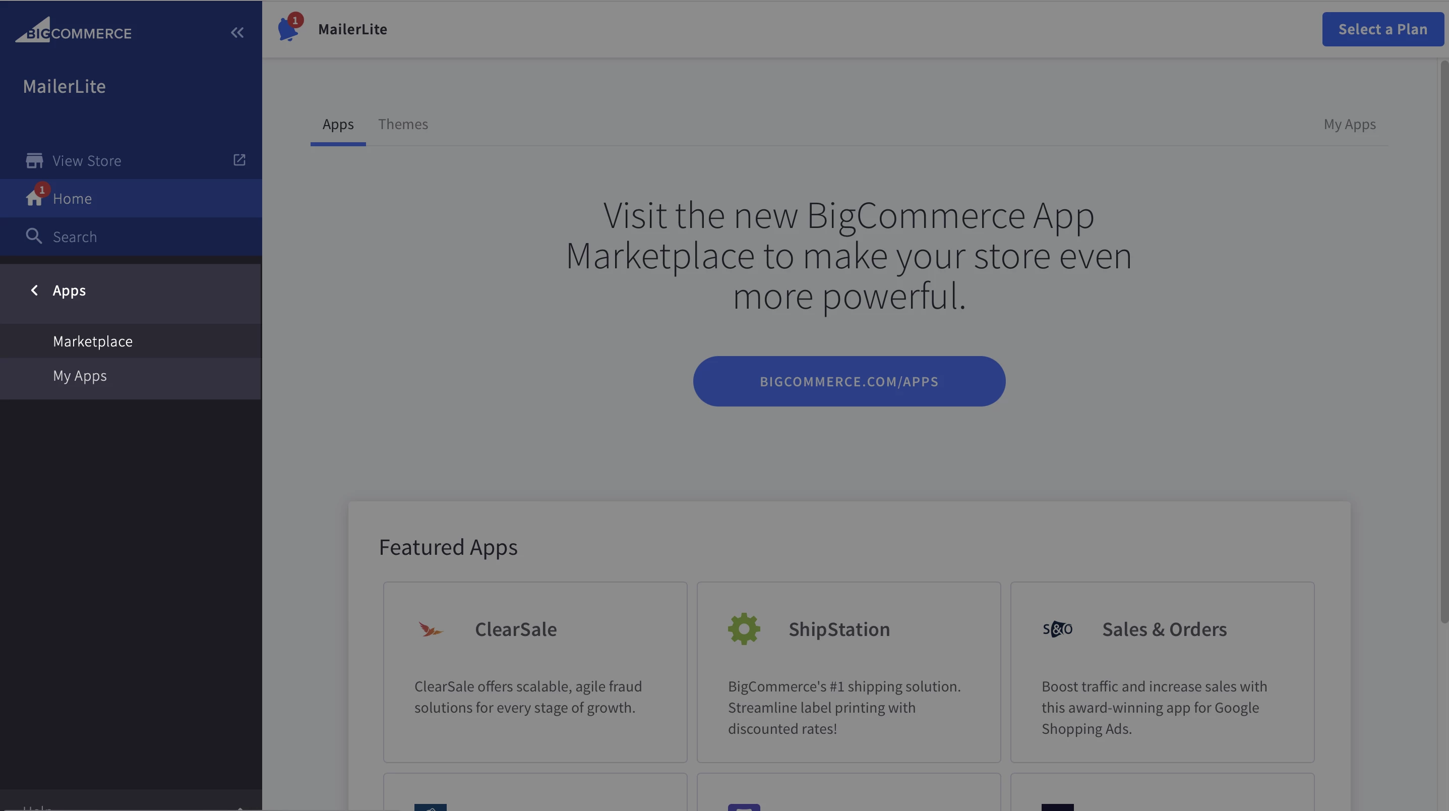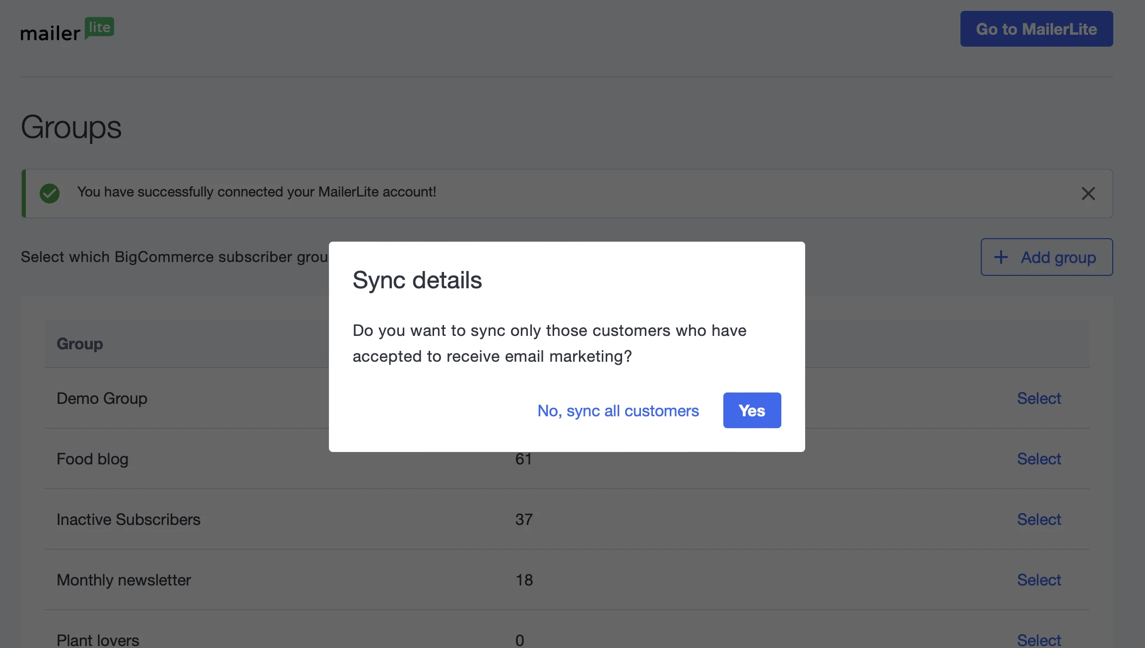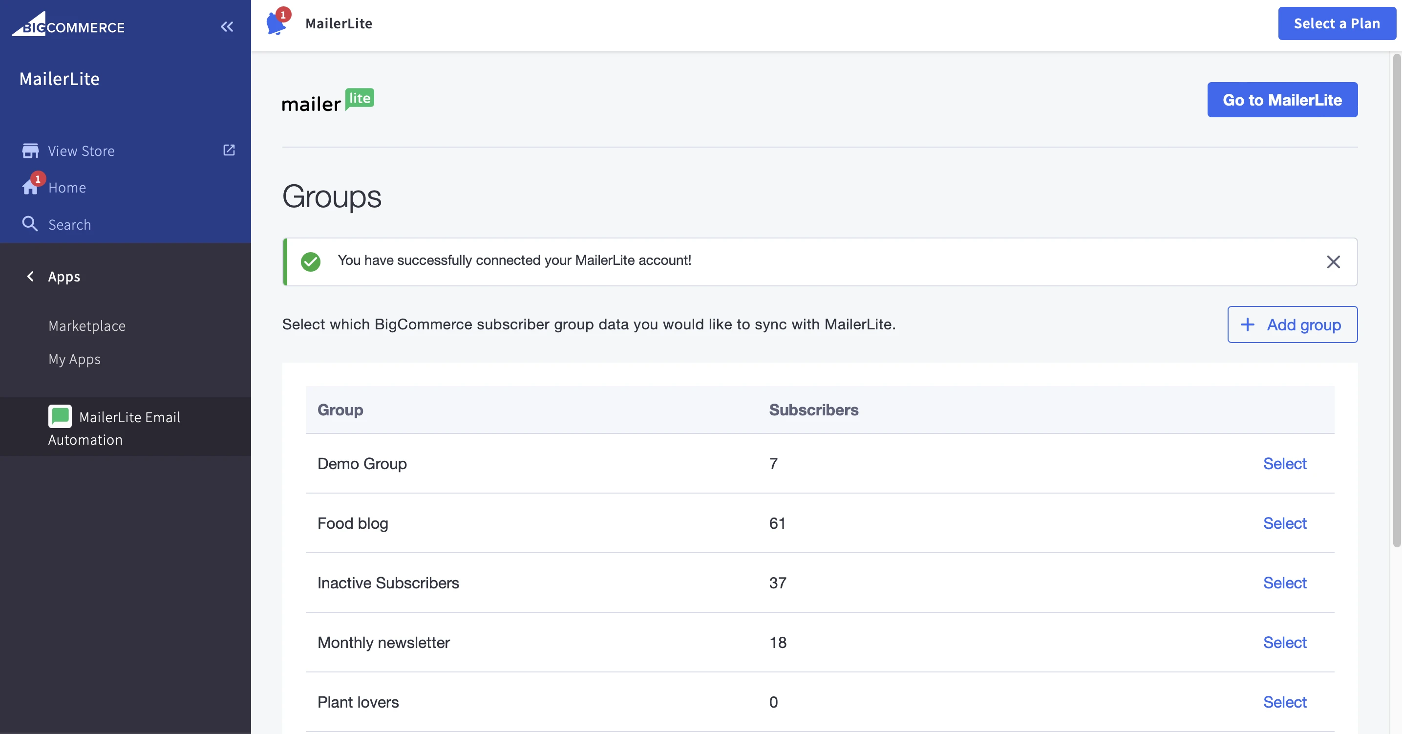 If the connection is successful, you will be redirected back to BigCommerce. Here, you can select a MailerLite group to sync your BigCommerce customers by clicking Select next to the chosen group. Only one group can be selected, but it can be changed at any time.