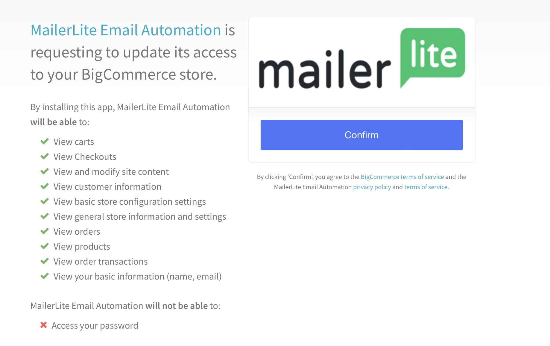 8. Click Confirm to allow MailerLite access to your BigCommerce store.