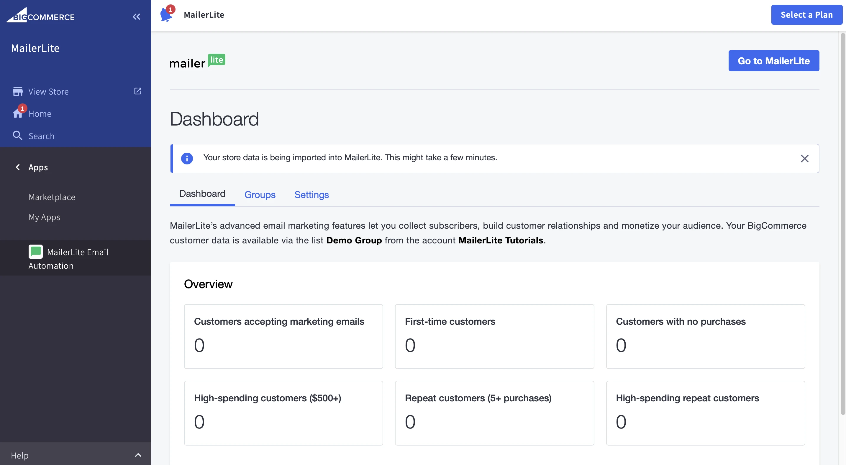 That’s it! Your data from BigCommerce will start importing to MailerLite. Once it is complete, you can find your BigCommerce customers in the group you selected, see your e-commerce data from the Dashboard in your Mailerlite account and new automation options for your customers.