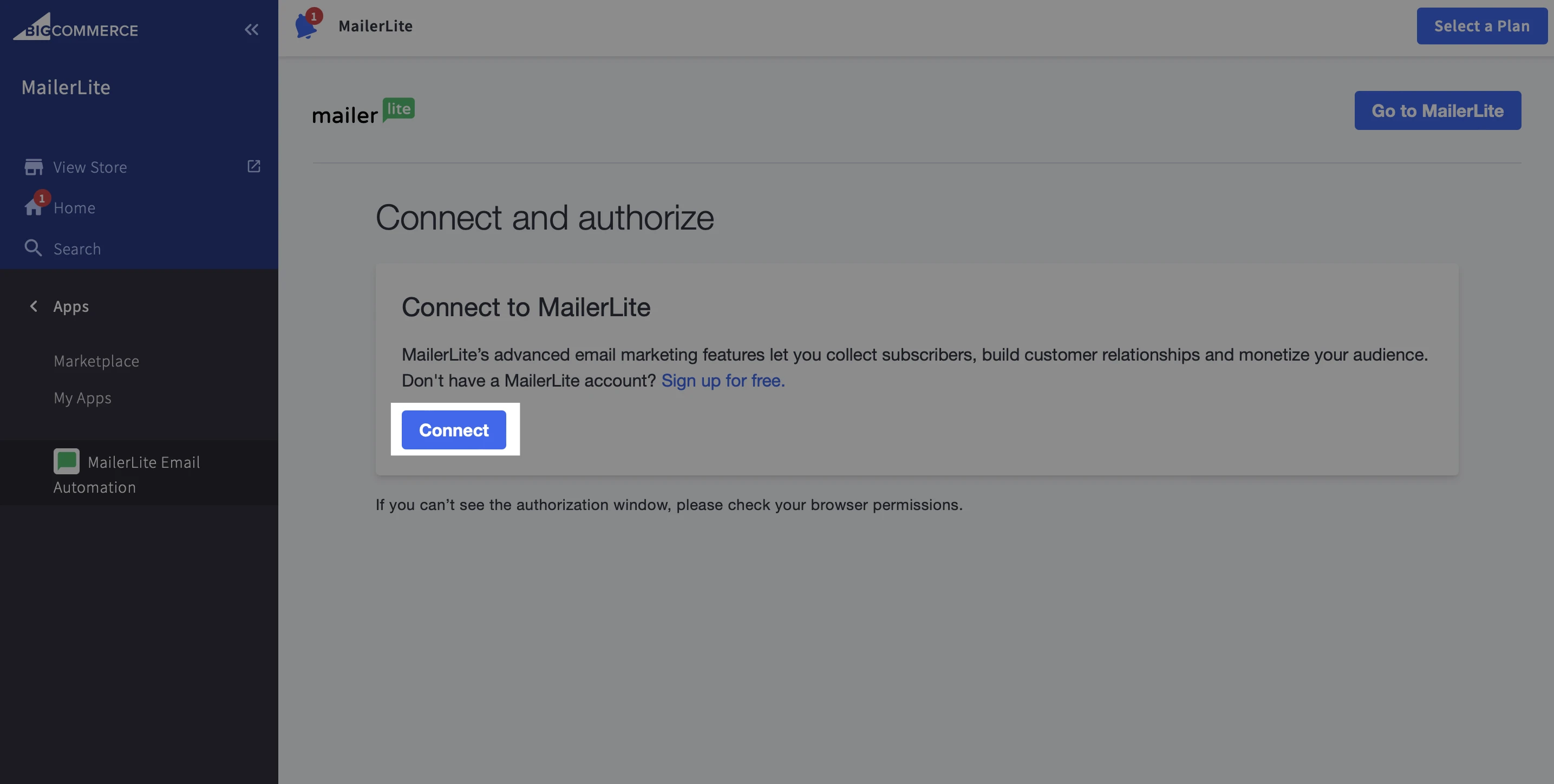 9. Connect and authorize your MailerLite account by clicking Connect.