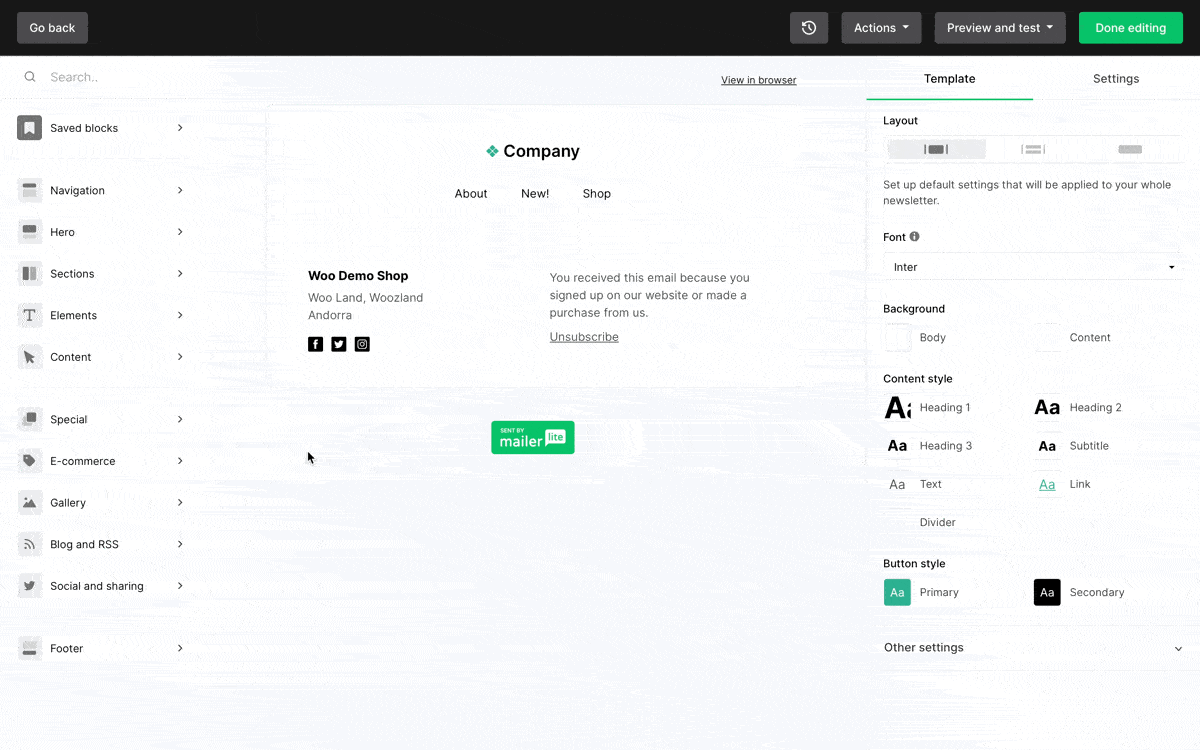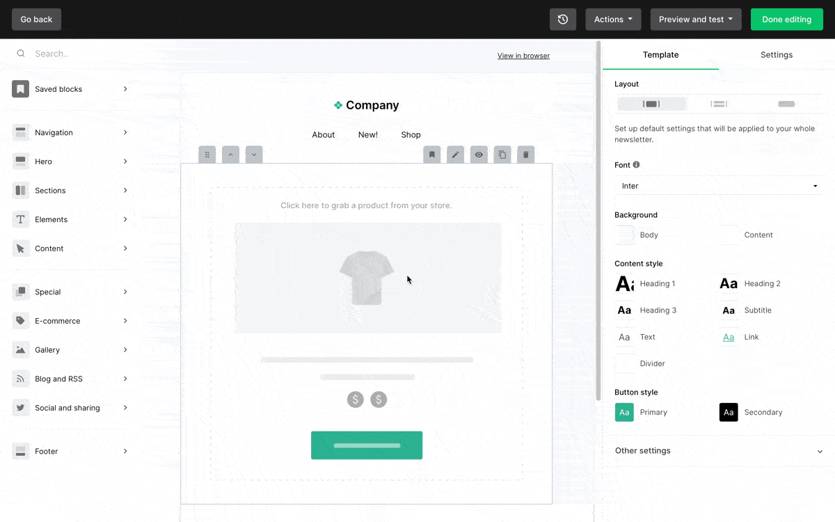 Save time drafting your newsletters and websites by using our e-commerce product blocks. Product blocks automatically import images, descriptions, and prices of your products and link directly to your Shopify store.
