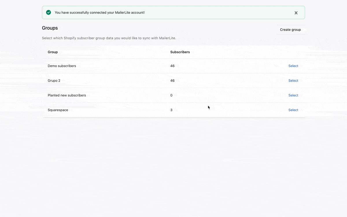 Once authorized, you will be asked to select the Subscriber group that you want your Shopify customers to be added to. You can also opt to create a new group.