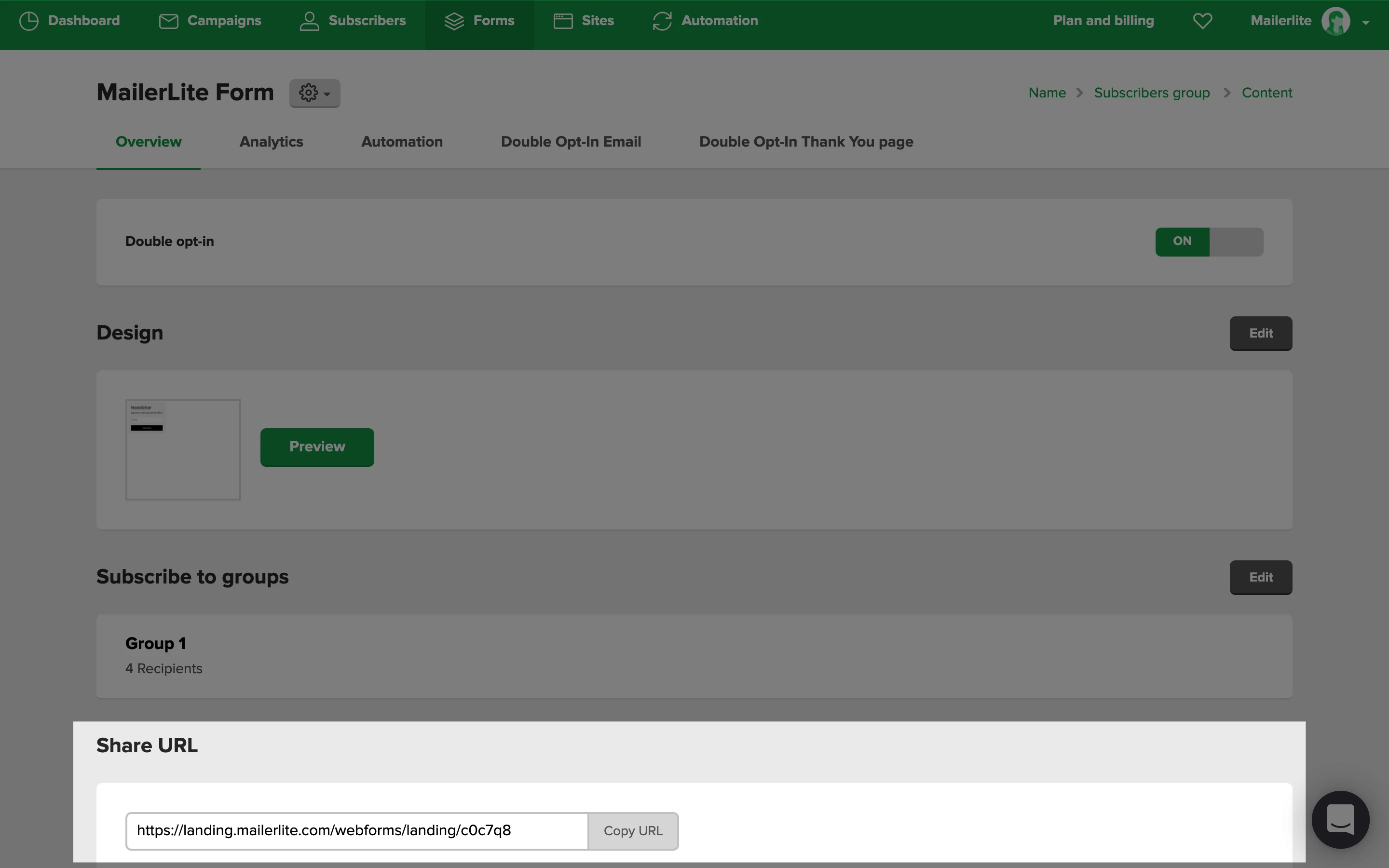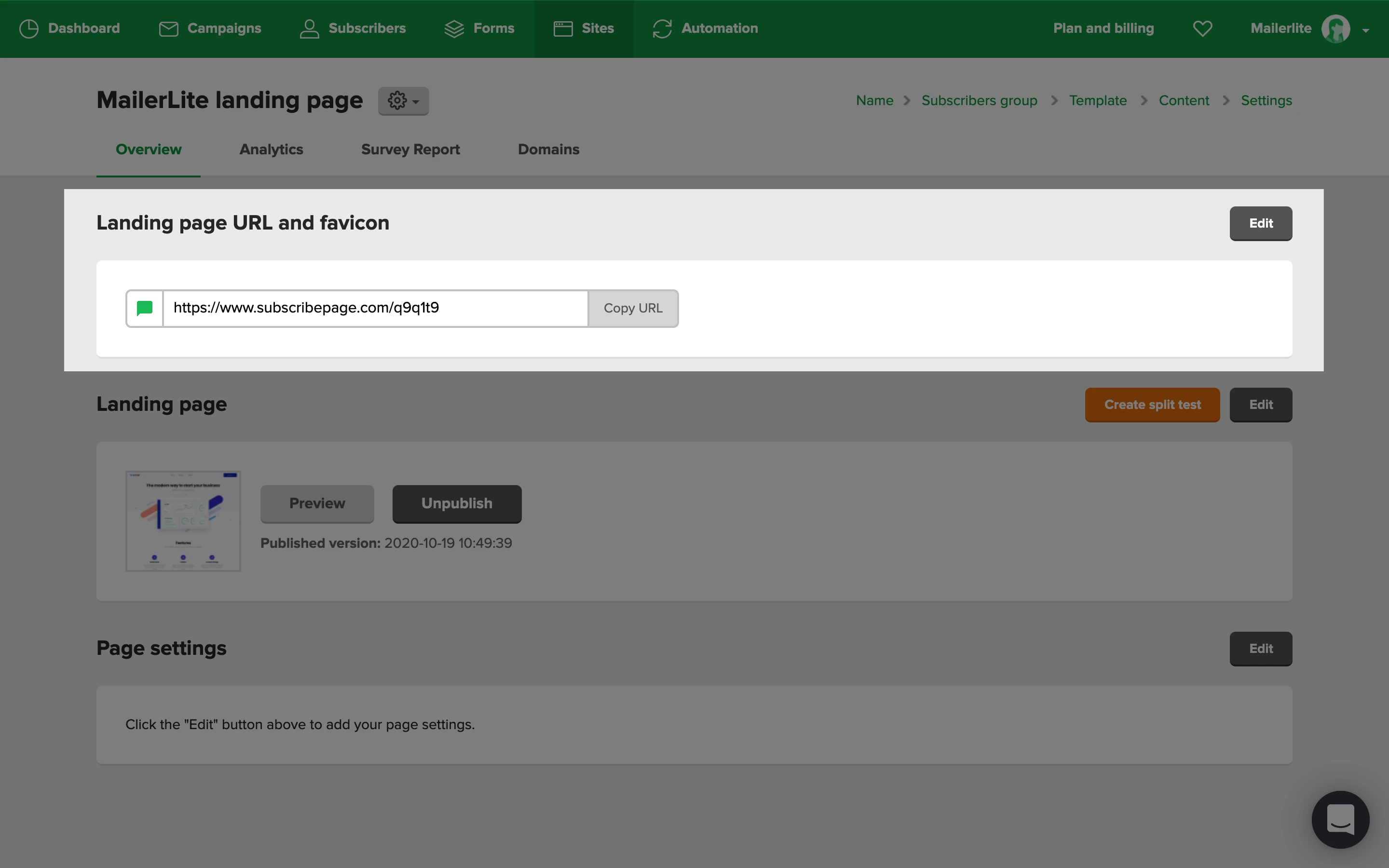 Each embedded form and landing page that you create in MailerLite has its own URL, which can be shared anywhere online, including in a Facebook post.